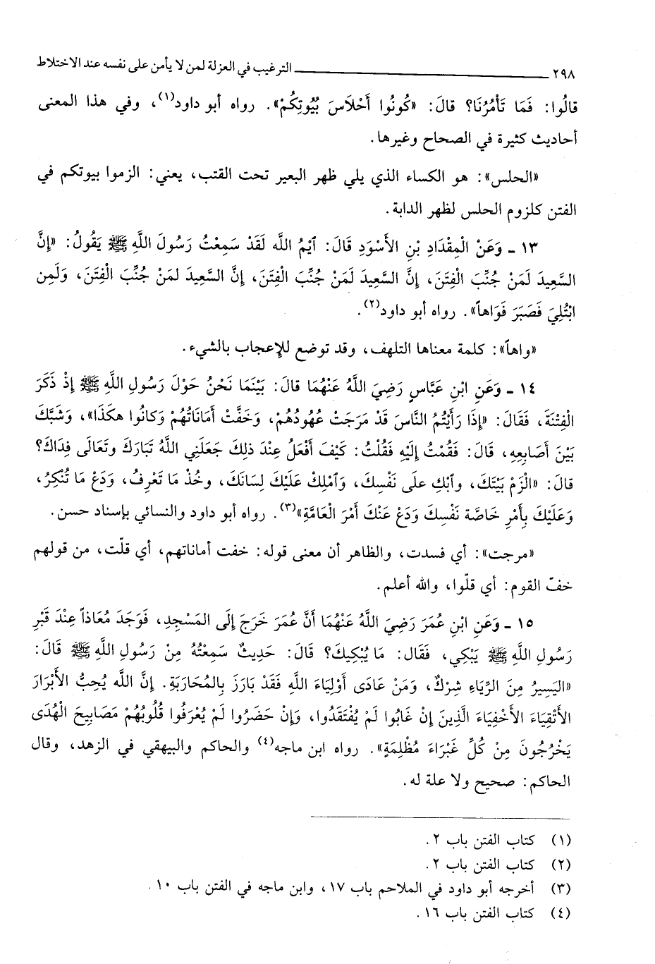 4150 - وَعَن ابْن عَبَّاس رَضِي الله عَنْهُمَا قَالَ بَيْنَمَا نَحن حول رَسُول الله صلى الله عَلَيْهِ وَسلم إِذْ ذكر الْفِتْنَة فَقَالَ إِذا رَأَيْتُمْ النَّاس قد مرجت عهودهم وَخفت أماناتهم وَكَانُوا هَكَذَا وَشَبك بَين أَصَابِعه قَالَ فَقُمْت إِلَيْهِ فَقلت كَيفَ أفعل عِنْد ذَلِك جعلني الله تبَارك وَتَعَالَى فدَاك قَالَ الزم بَيْتك وابك على نَفسك واملك عَلَيْك لسَانك وَخذ مَا تعرف ودع مَا تنكر وَعَلَيْك بِأَمْر خَاصَّة نَفسك ودع عَنْك أَمر الْعَامَّة