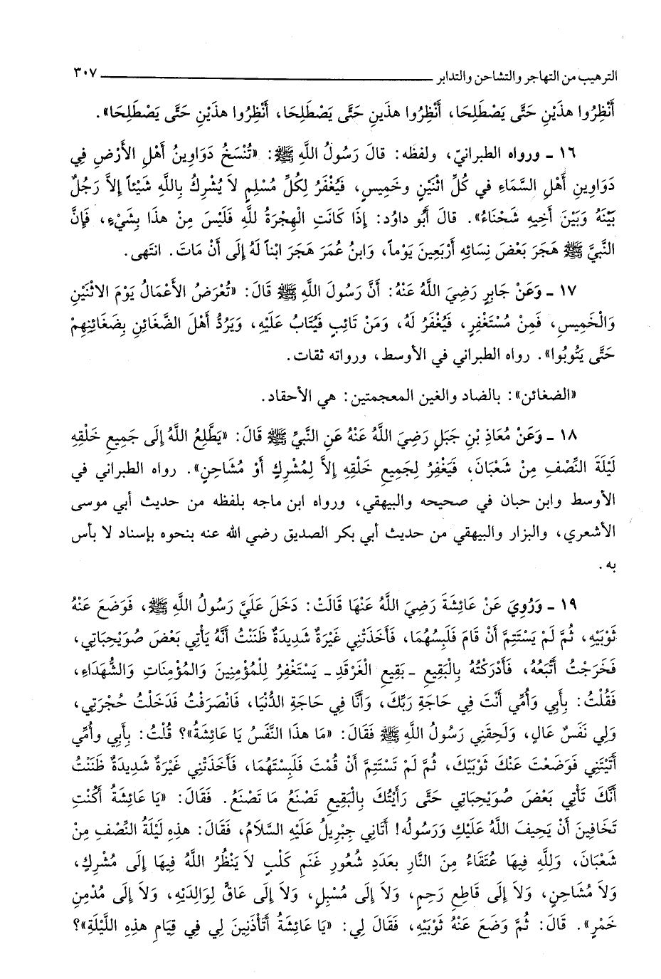 فَقَالَ يَا عَائِشَة أَكنت تَخَافِينَ أَن يَحِيف الله عَلَيْك وَرَسُوله أَتَانِي جِبْرِيل عَلَيْهِ السَّلَام فَقَالَ هَذِه لَيْلَة النّصْف من شعْبَان وَللَّه فِيهَا عُتَقَاء من النَّار بِعَدَد شُعُور غنم كلب لَا ينظر الله فِيهَا إِلَى مُشْرك وَلَا مُشَاحِن وَلَا إِلَى قَاطع رحم وَلَا إِلَى مُسبل وَلَا إِلَى عَاق لوَالِديهِ وَلَا إِلَى مدمن خمر