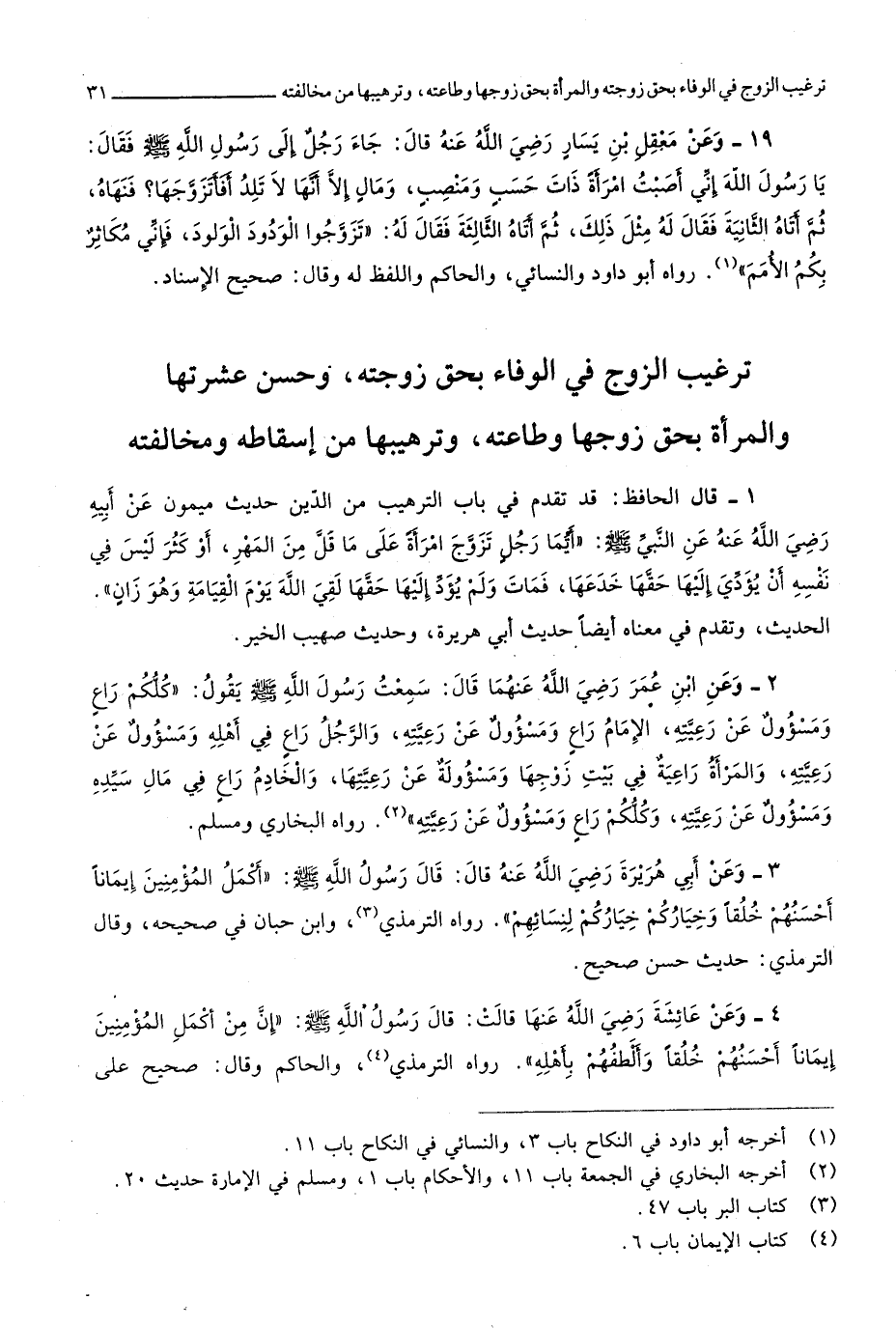 ترغيب الزَّوْج فِي الْوَفَاء بِحَق زَوجته وَحسن عشرتها وَالْمَرْأَة بِحَق زَوجهَا وطاعته وترهيبها من إِسْقَاطه ومخالفته