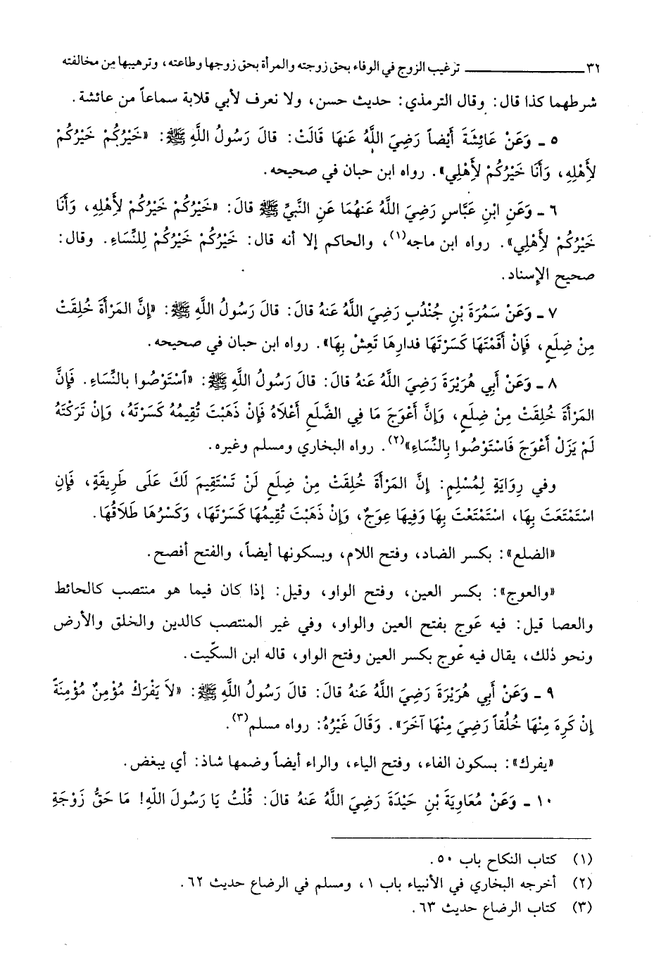 فَإِن الْمَرْأَة خلقت من ضلع وَإِن أَعْوَج مَا فِي الضلع أَعْلَاهُ فَإِن ذهبت تُقِيمهُ كَسرته وَإِن تركته لم يزل أَعْوَج فَاسْتَوْصُوا بِالنسَاء