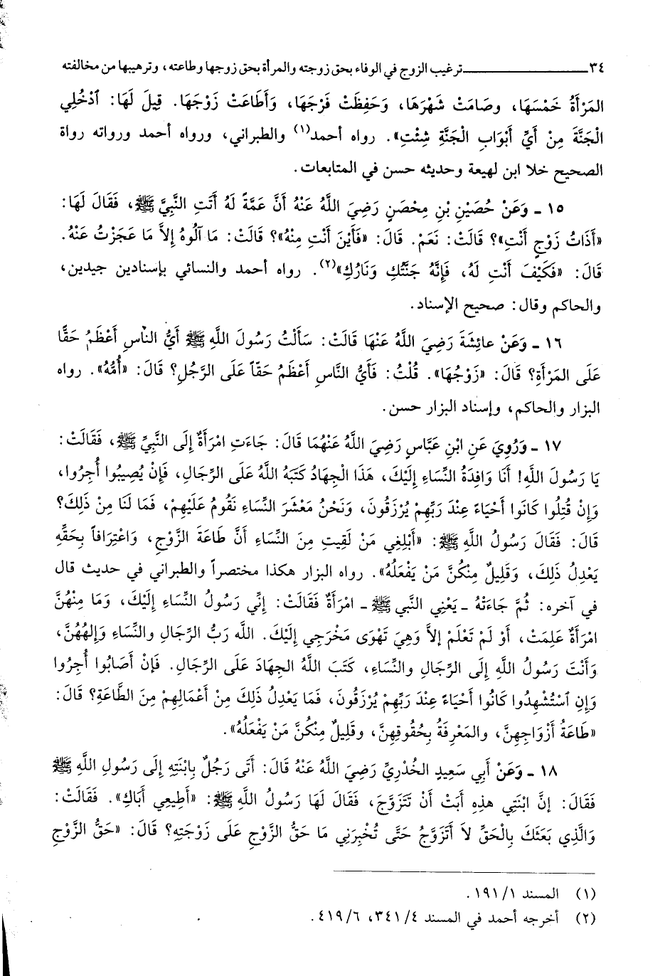 فَقَالَت وَالَّذِي بَعثك بِالْحَقِّ لَا أَتزوّج حَتَّى تُخبرنِي مَا حق الزَّوْج على زَوجته قَالَ حق الزَّوْج