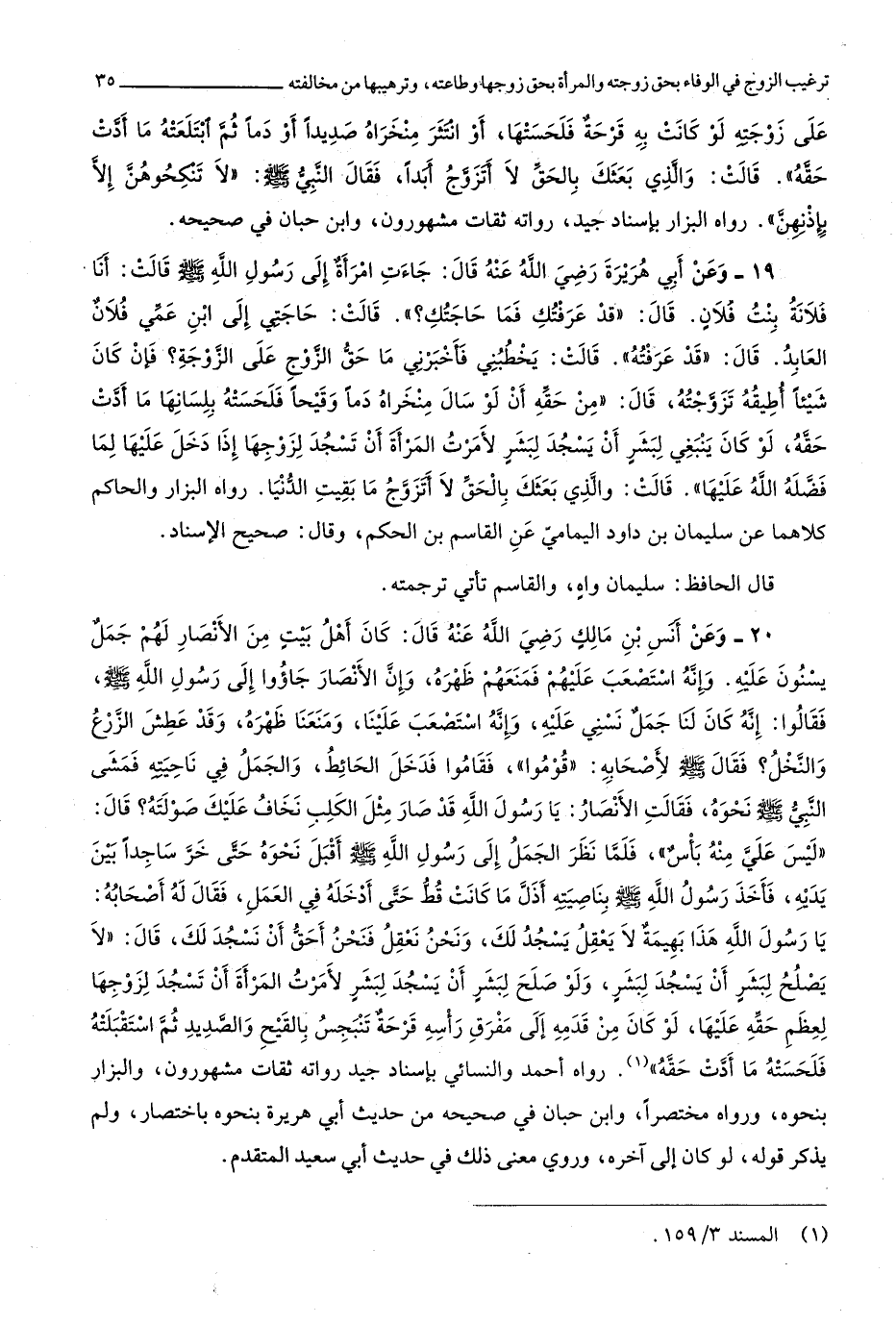 وَإنَّهُ استصعب عَلَيْهِم فَمَنعهُمْ ظَهره وَإِن الْأَنْصَار جاؤوا إِلَى رَسُول الله صلى الله عَلَيْهِ وَسلم فَقَالُوا إِنَّه كَانَ لنا جمل نسني عَلَيْهِ وَإنَّهُ استصعب علينا ومنعنا ظَهره وَقد عَطش الزَّرْع وَالنَّخْل فَقَالَ صلى الله عَلَيْهِ وَسلم لاصحابه قومُوا فَقَامُوا فَدخل الْحَائِط والجمل فِي ناحيته فَمشى النَّبِي صلى الله عَلَيْهِ وَسلم نَحوه فَقَالَت الْأَنْصَار يَا رَسُول الله قد صَار مثل الْكَلْب نَخَاف عَلَيْك صولته قَالَ لَيْسَ عَليّ مِنْهُ بَأْس فَلَمَّا نظر الْجمل إِلَى رَسُول الله صلى الله عَلَيْهِ وَسلم أقبل نَحوه حَتَّى خر سَاجِدا بَين يَدَيْهِ فَأخذ رَسُول الله صلى الله عَلَيْهِ وَسلم بناصيته أذلّ مَا كَانَت قطّ حَتَّى أدخلهُ فِي الْعَمَل فَقَالَ لَهُ أَصْحَابه يَا رَسُول الله هَذَا بَهِيمَة لَا يعقل يسْجد لَك وَنحن نعقل فَنحْن أَحَق أَن نسجد لَك قَالَ لَا يصلح لبشر أَن يسْجد لبشر وَلَو صلح لبشر أَن يسْجد لبشر لأمرت الْمَرْأَة أَن تسْجد لزَوجهَا لعظم حَقه عَلَيْهَا لَو كَانَ من قدمه إِلَى مفرق رَأسه قرحَة تنبجس بالقيح والصديد ثمَّ استقبلته فلحسته مَا أدَّت حَقه