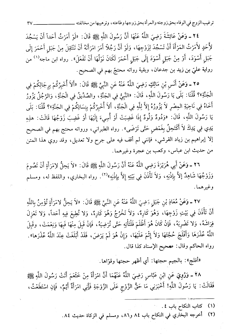 2984 - وَعَن معَاذ بن جبل رَضِي الله عَنهُ عَن النَّبِي صلى الله عَلَيْهِ وَسلم قَالَ لَا يحل لامْرَأَة تؤمن بِاللَّه أَن تَأذن فِي بَيت زَوجهَا وَهُوَ كَارِه وَلَا تخرج وَهُوَ كَارِه وَلَا تطيع فِيهِ أحدا وَلَا تعزل فرَاشه وَلَا تضربه فَإِن كَانَ هُوَ أظلم فلتأته حَتَّى ترضيه فَإِن قبل مِنْهَا فبها ونعمت وَقبل الله عذرها وأفلج حجتها وَلَا إِثْم عَلَيْهَا وَإِن هُوَ لم يرض فقد أبلغت عِنْد الله عذرها