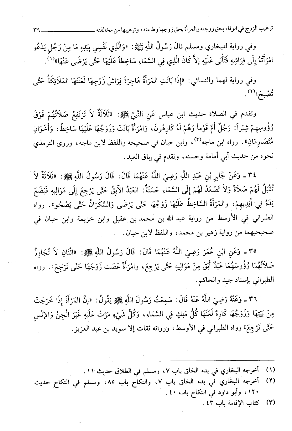 وَتقدم فِي الصَّلَاة حَدِيث ابْن عَبَّاس عَن النَّبِي صلى الله عَلَيْهِ وَسلم ثَلَاثَة لَا ترْتَفع صلَاتهم فَوق رؤوسهم شبْرًا رجل أم قوما وهم لَهُ كَارِهُون وَامْرَأَة باتت وَزوجهَا عَلَيْهَا ساخط وَأَخَوَانِ متصارمان
