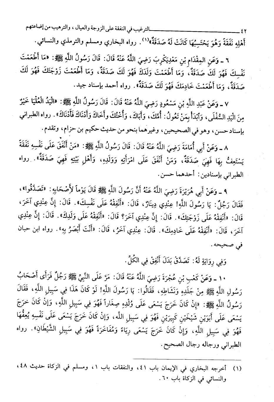 3004 - وَعَن أبي أُمَامَة رَضِي الله عَنهُ قَالَ قَالَ رَسُول الله صلى الله عَلَيْهِ وَسلم من أنْفق على نَفسه نَفَقَة يستعف بهَا فَهِيَ صَدَقَة وَمن أنْفق على امْرَأَته وَولده وَأهل بَيته فَهِيَ صَدَقَة