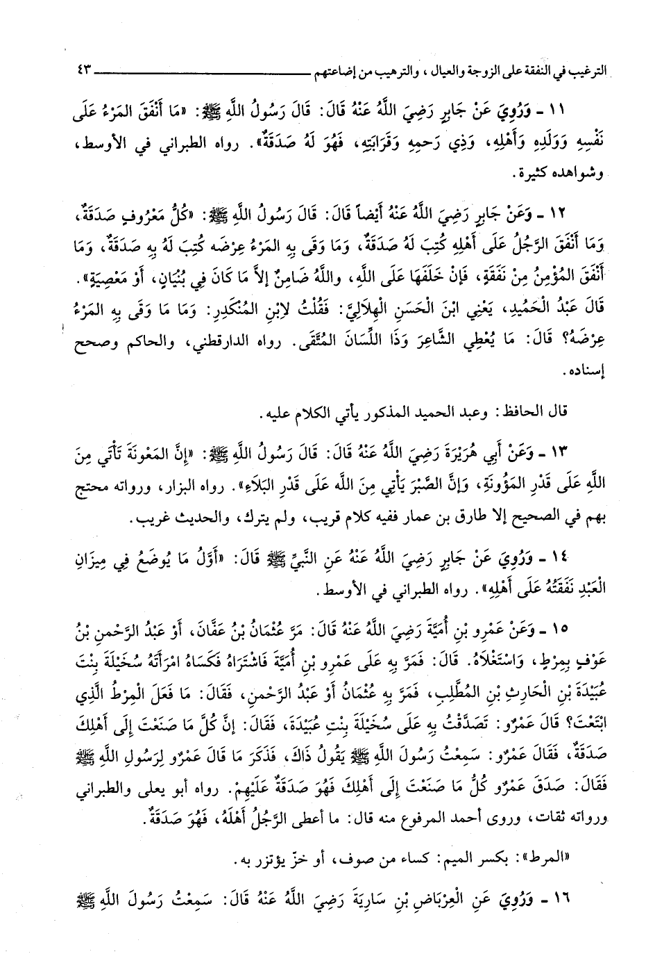 3010 - وَرُوِيَ عَن جَابر رَضِي الله عَنهُ عَن النَّبِي صلى الله عَلَيْهِ وَسلم قَالَ أول مَا يوضع فِي ميزَان العَبْد نَفَقَته على أَهله
