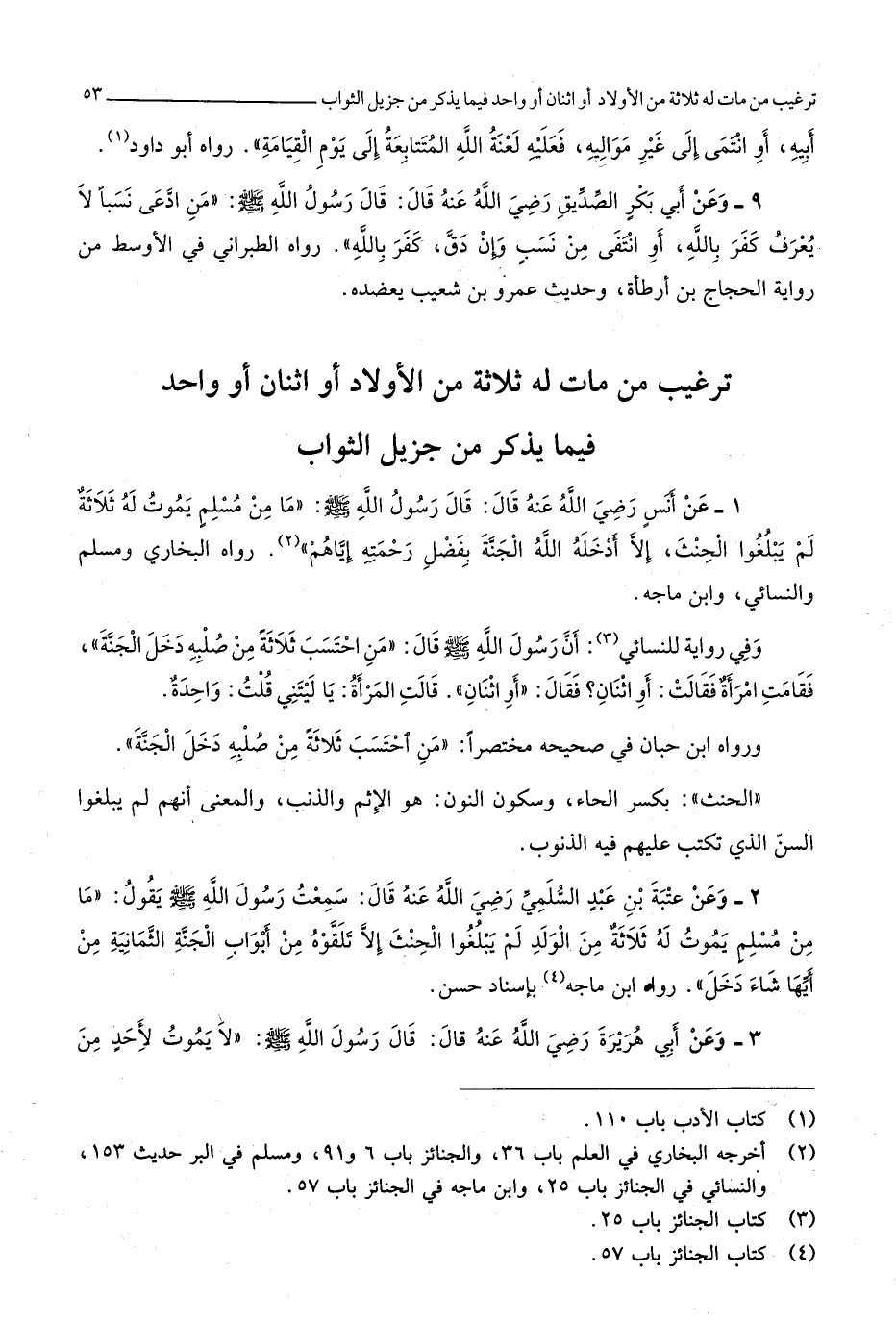 ترغيب من مَاتَ لَهُ ثَلَاثَة من الْأَوْلَاد أَو اثْنَان أَو وَاحِد فِيمَا يذكر من جزيل الثَّوَاب