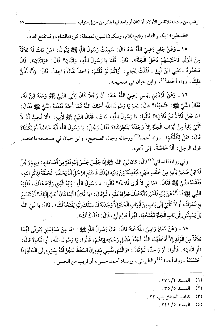 قَالُوا أَو وَاحِد ثمَّ قَالَ وَالَّذِي نَفسِي بِيَدِهِ إِن السقط ليجر أمه بسرره إِلَى الْجنَّة إِذا احتسبته رَوَاهُ أَحْمد وَالطَّبَرَانِيّ وَإسْنَاد أَحْمد حسن أَو قريب من الْحسن