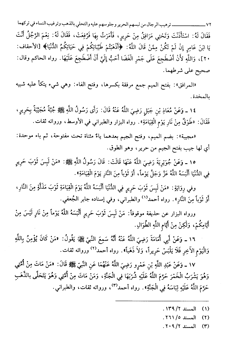 فَقَالَ لَهُ اسْتَأْذَنت وتحتي مرافق من حَرِير فَأمرت بهَا فَرفعت فَقَالَ لَهُ نعم الرجل أَنْت يَا ابْن عَامر إِن لم تكن مِمَّن قَالَ الله أَذهَبْتُم طَيِّبَاتكُمْ فِي حَيَاتكُم الدُّنْيَا الْأَحْقَاف 02 وَالله لِأَن أضطجع على جمر الغضا أحب إِلَيّ أَن أضطجع عَلَيْهَا
