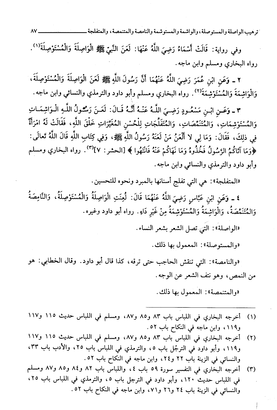 3191 - وَعَن ابْن مَسْعُود رَضِي الله عَنهُ أَنه قَالَ لعن رَسُول الله الْوَاشِمَات وَالْمُسْتَوْشِمَات وَالْمُتَنَمِّصَات وَالْمُتَفَلِّجَات لِلْحسنِ الْمُغيرَات خلق الله فَقَالَت لَهُ امْرَأَة فِي ذَلِك فَقَالَ وَمَا لي لَا ألعن من لَعنه رَسُول الله صلى الله عَلَيْهِ وَسلم وَفِي كتاب الله قَالَ الله تَعَالَى وَمَا آتَاكُم الرَّسُول فَخُذُوهُ وَمَا نهاكم عَنهُ فَانْتَهوا الْحَشْر 7