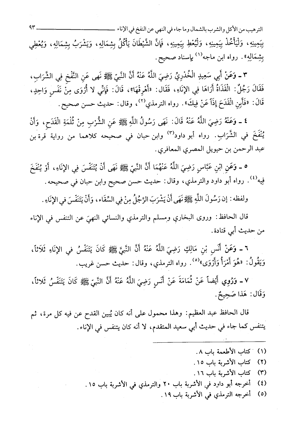 3210 - وَعَن أبي سعيد الْخُدْرِيّ رَضِي الله عَنهُ أَن النَّبِي صلى الله عَلَيْهِ وَسلم نهى عَن النفخ فِي الشَّرَاب فَقَالَ رجل القذاة أَرَاهَا فِي الْإِنَاء فَقَالَ أهرقها قَالَ فَإِنِّي لَا أروى من نفس وَاحِد قَالَ فَأَبِنْ الْقدح إِذا عَن فِيك