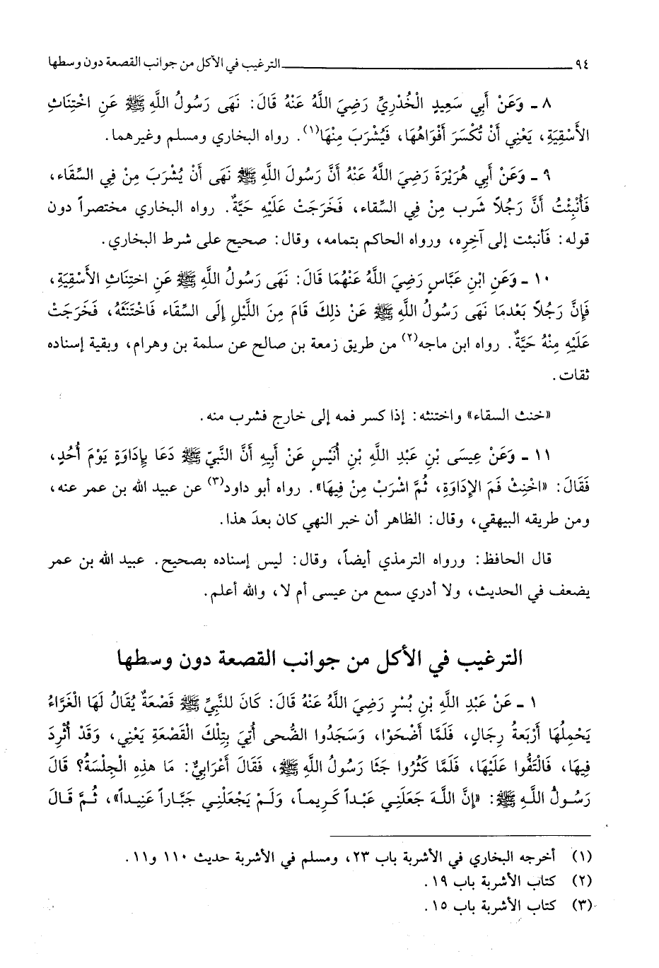 3215 - وَعَن أبي سعيد الْخُدْرِيّ رَضِي الله عَنهُ قَالَ نهى رَسُول الله صلى الله عَلَيْهِ وَسلم عَن اختناث الأسقية يَعْنِي أَن تكسر أفواهها فيشرب مِنْهَا