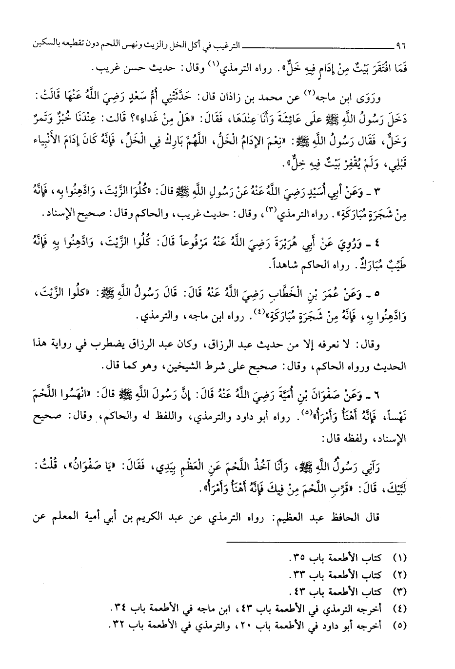 رَوَاهُ أَبُو دَاوُد وَالتِّرْمِذِيّ وَاللَّفْظ لَهُ وَالْحَاكِم وَقَالَ صَحِيح الْإِسْنَاد وَلَفظه قَالَ رَآنِي رَسُول الله صلى الله عَلَيْهِ وَسلم وَأَنا آخذ اللَّحْم عَن الْعظم بيَدي فَقَالَ يَا صَفْوَان قلت لبيْك قَالَ قرب اللَّحْم من فِيك فَإِنَّهُ أهنأ وأمرأ
