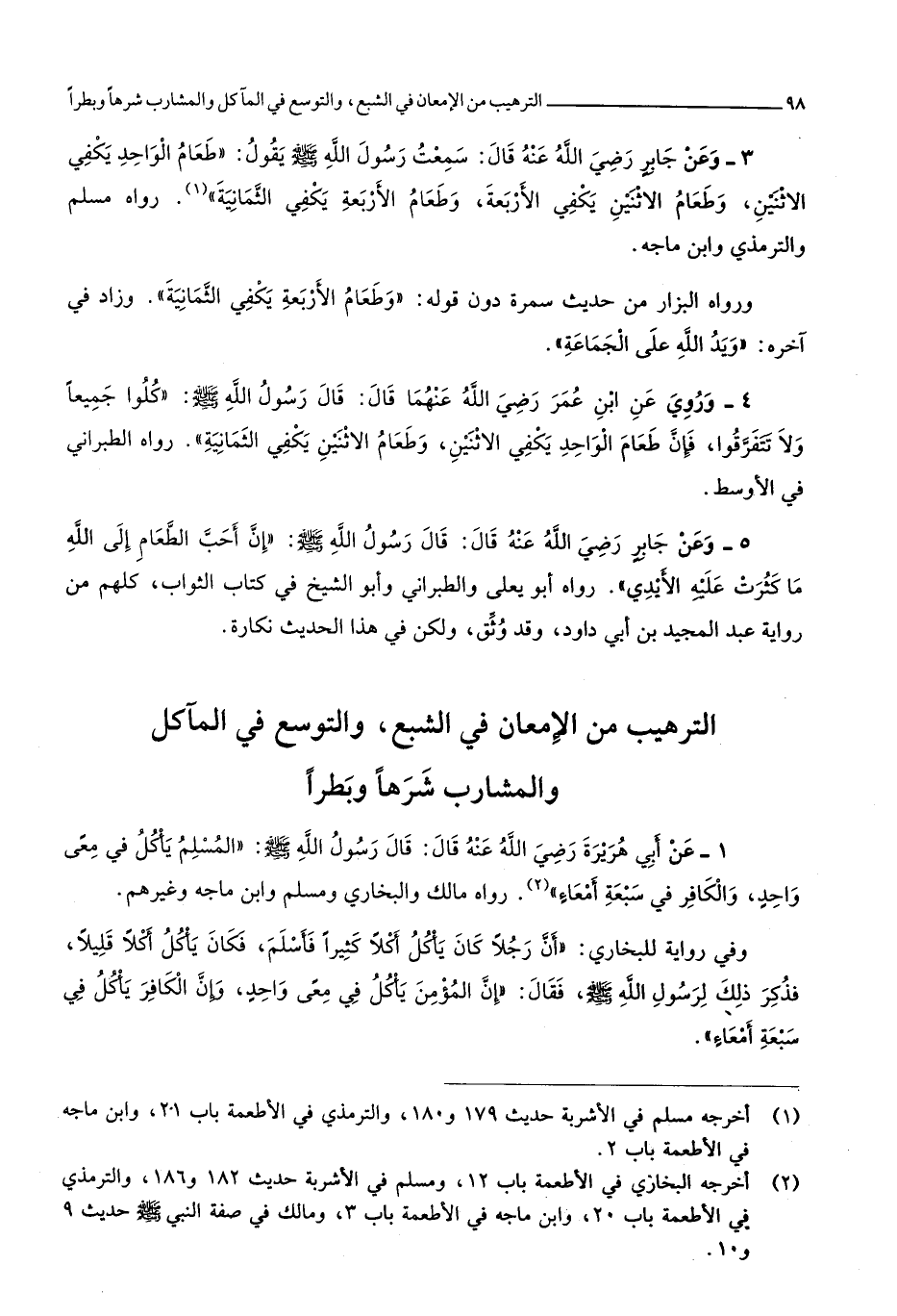3230 - وَعَن جَابر رَضِي الله عَنهُ قَالَ سَمِعت رَسُول الله صلى الله عَلَيْهِ وَسلم يَقُول طَعَام الْوَاحِد يَكْفِي الِاثْنَيْنِ وَطَعَام الِاثْنَيْنِ يَكْفِي الْأَرْبَعَة وَطَعَام الْأَرْبَعَة يَكْفِي الثَّمَانِية