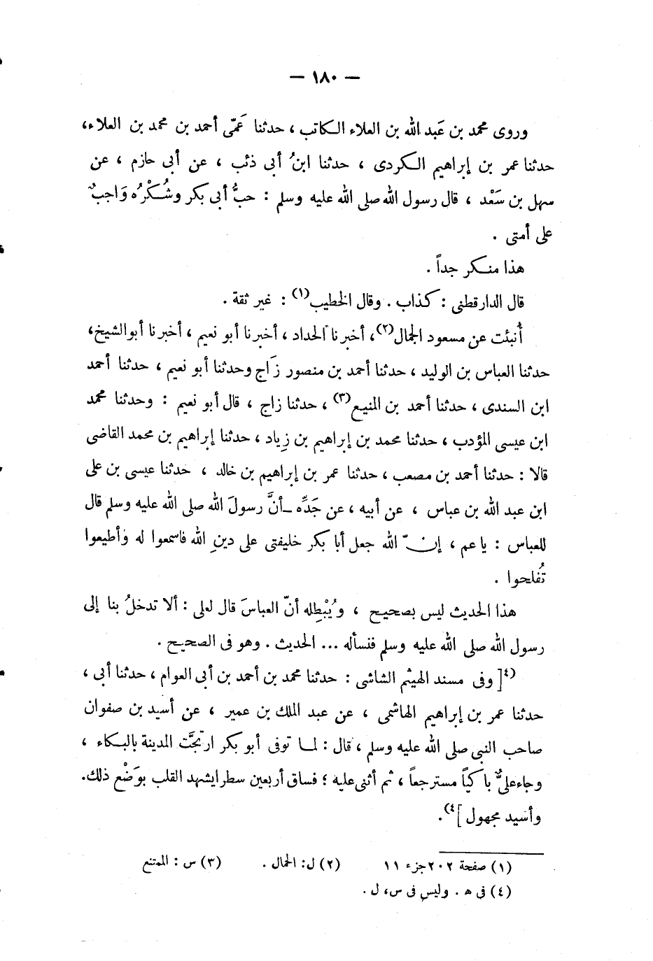 وروى محمد بن عبد الله بن العلاء الكاتب، حدثنا عمى أحمد بن محمد بن العلاء، حدثنا عمر بن إبراهيم الكردى، حدثنا ابن أبي ذئب، عن أبي حازم، عن سهل بن سعد، قال رسول الله صلى الله عليه وسلم: حب أبي بكر وشكره واجب على أمتى.