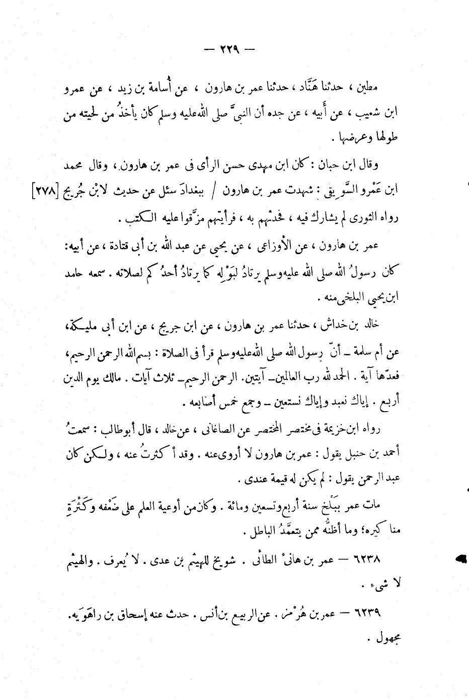 وقال ابن حبان: كان ابن مهدي حسن الرأى في عمر بن هارون، وقال محمد ابن عمرو السويقى: شهدت عمر بن هارون / ببغداد سئل عن حديث لابن جريج رواه الثوري لم يشارك فيه، فحدثهم به، فرأيتهم مزقوا عليه الكتب.