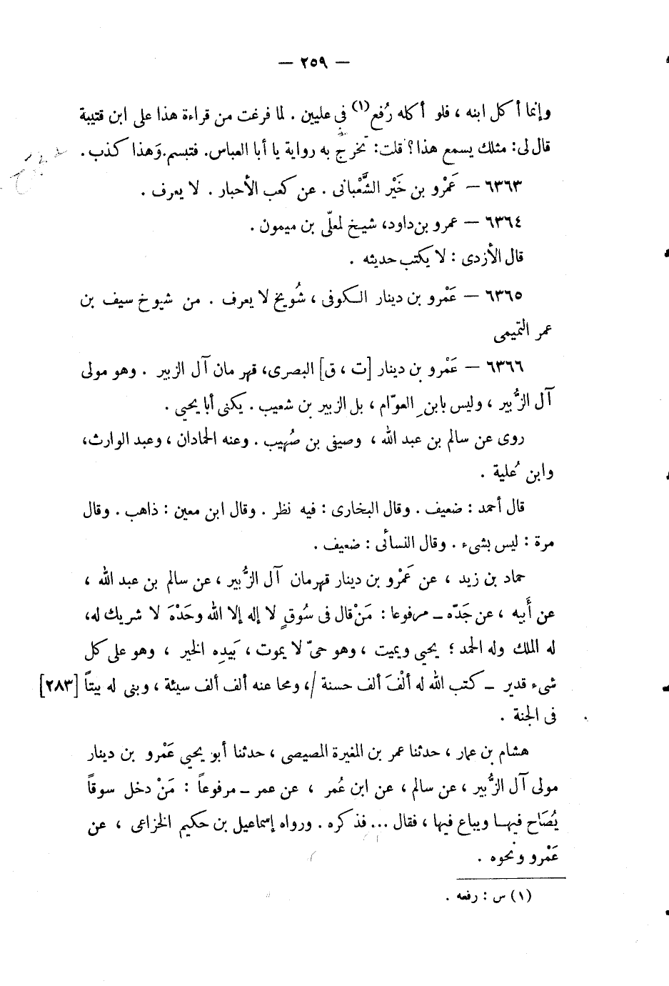 هشام بن عمار، حدثنا عمر بن المغيرة المصيصى، حدثنا أبويحيى عمرو بن دينار مولى آل الزبير، عن سالم، عن ابن عمر، عن عمر - مرفوعاً: من دخل سوقا