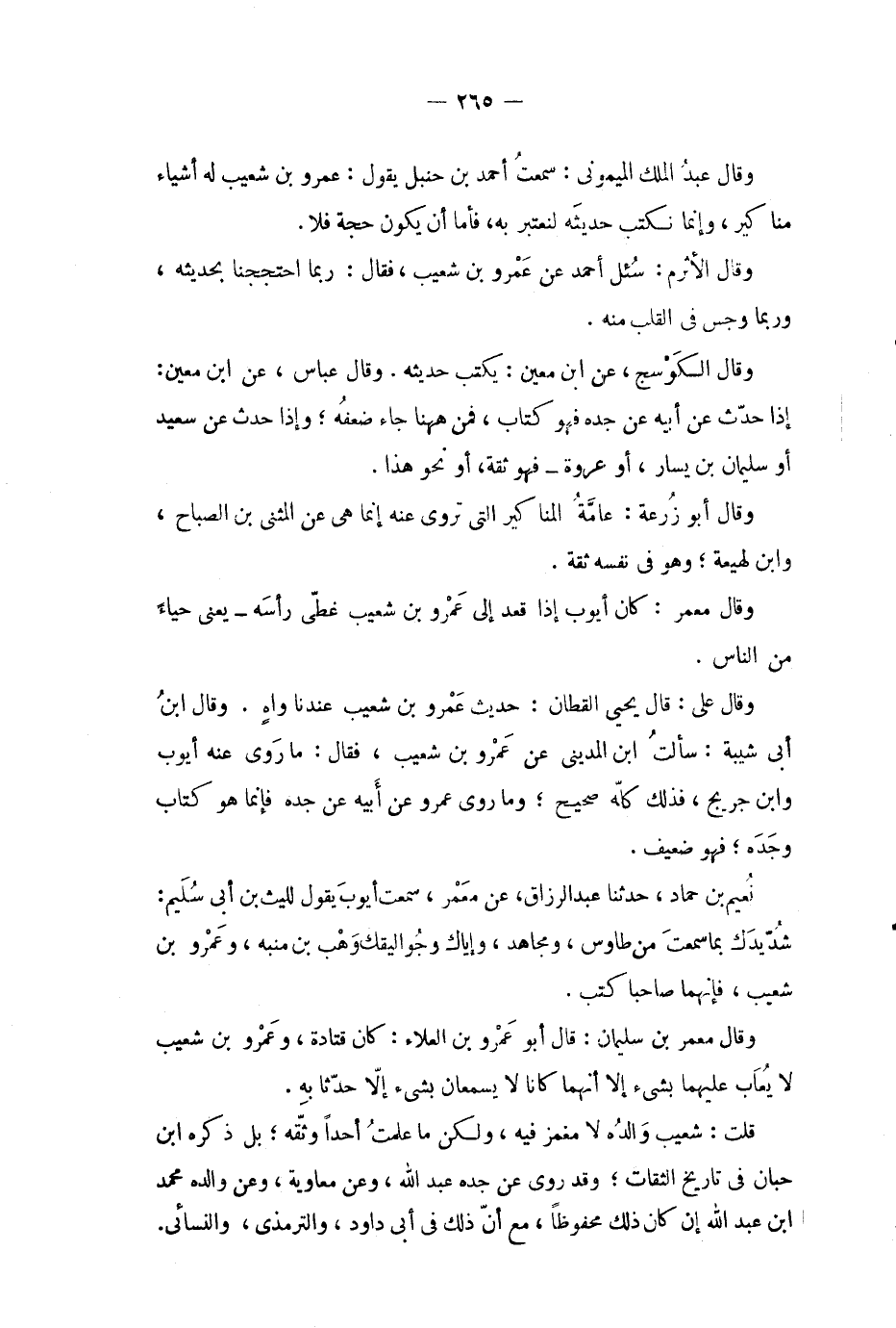 قلت: شعيب والده لا مغمز فيه، ولكن ما علمت أحدا وثقه، بل ذكره ابن حبان في تاريخ الثقات، وقد روى عن جده عبد الله، وعن معاوية، وعن والده محمد ابن عبد الله إن كان ذلك محفوظا، مع أن ذلك في أبي داود، والترمذي، والنسائي.