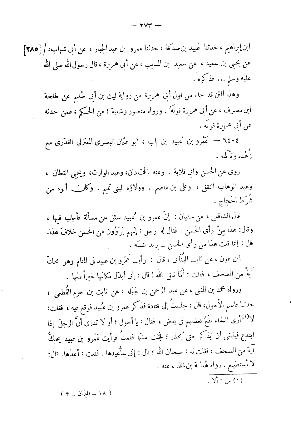 ورواه محمد بن المثنى، عن عبد الرحمن بن جبلة، عن ثابت بن حزم القطعي، حدثنا عاصم الأحول، قال: جلست إلى قتادة فذكر عمرو بن عبيد فوقع فيه، فقلت: لا (1) أرى العلماء يقع بعضهم في بعض، فقال: يا أحول، أو لا تدرى أن الرجل إذا ابتدع فينبغي أن يذكر حتى يحذر، فجئت مغتما فقمت فرأيت عمرو بن عبيد يحك آية من المصحف، فقلت له: سبحان الله، قال: إنى سأعيدها.