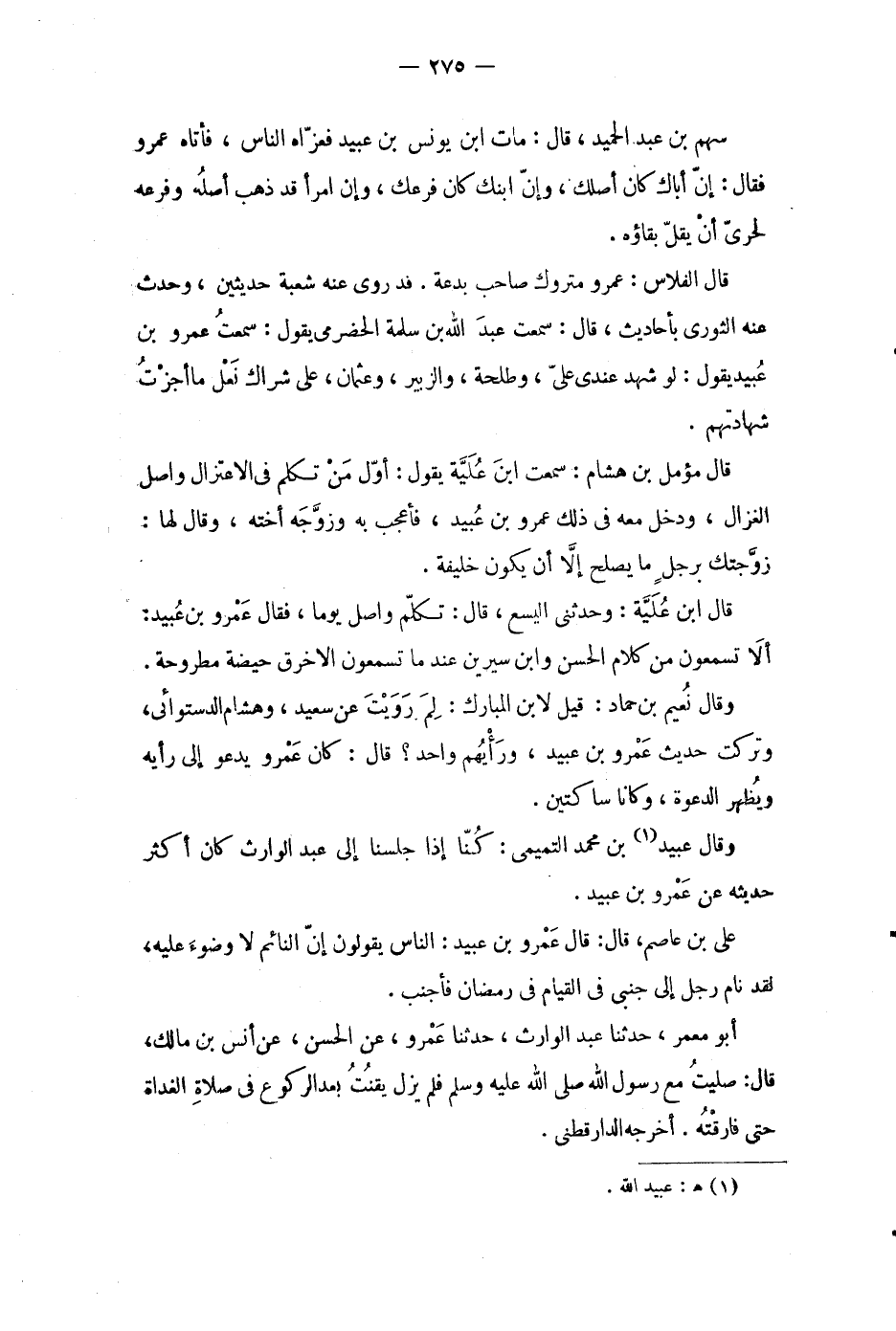 وقال نعيم بن حماد: قيل لابن المبارك: لم رويت عن سعيد، وهشام الدستوائى، وتركت حديث عمرو بن عبيد، ورأيهم واحد؟ قال: كان عمرو يدعو إلى رأيه ويظهر الدعوة، وكانا ساكتين.