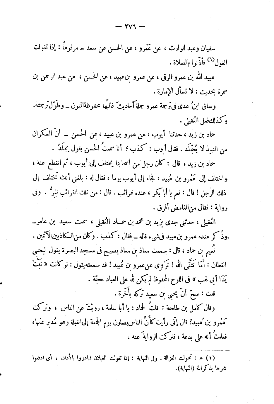 نعيم بن حماد، قال: سمعت معاذ بن معاذ يصيح في مسجد البصرة يقول ليحيى القطان: أما تتقى الله! تروى عن عمرو بن عبيد! قد سمعته يقول: لو كانت " تبت يدا أبي لهب " في اللوح المحفوظ لم يكن لله على العباد حجة.