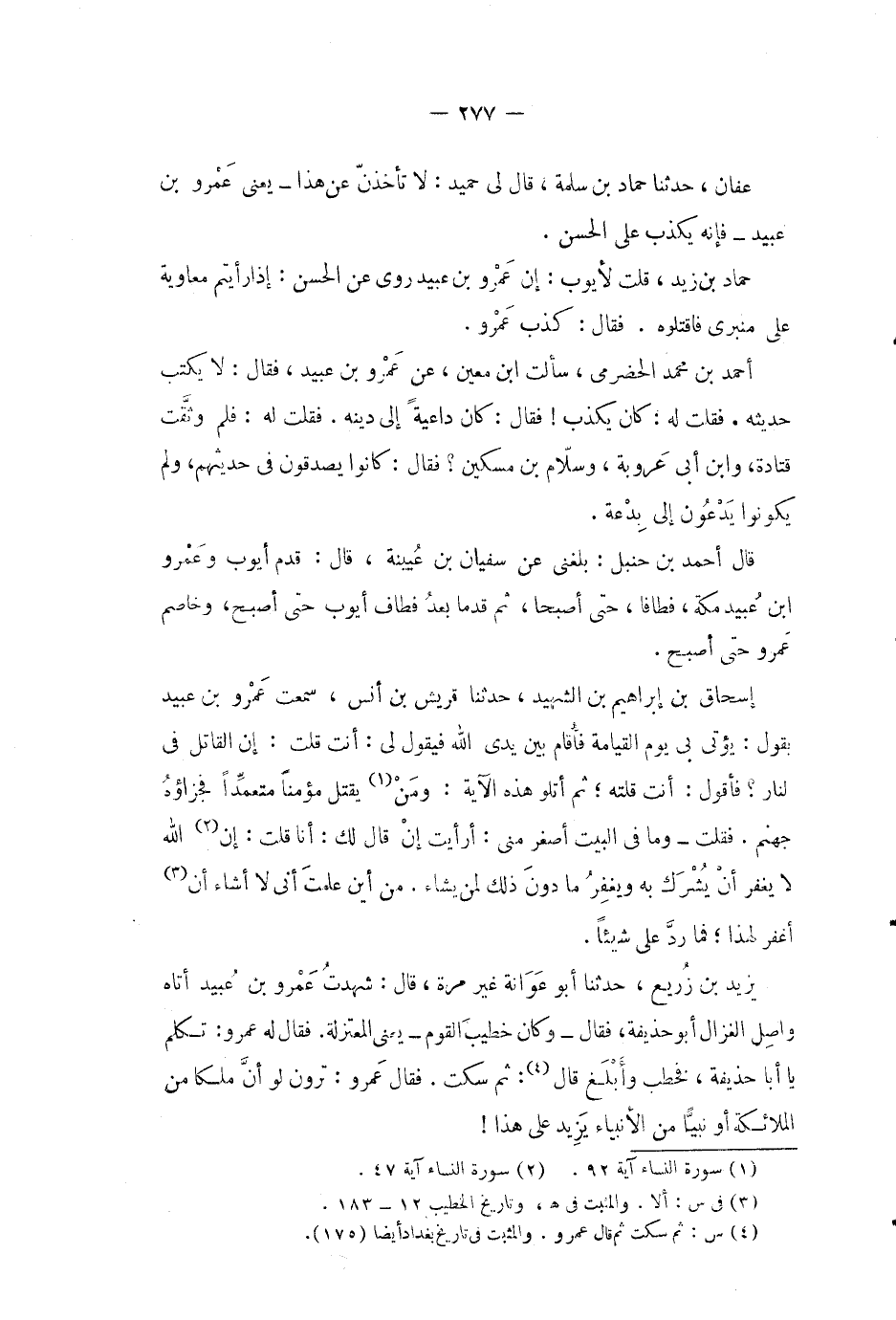 إسحاق بن إبراهيم بن الشهيد، حدثنا قريش بن أنس، سمعت عمرو بن عبيد يقول: يؤتى بى يوم القيامة فأقام بين يدى الله فيقول لى: أنت قلت: إن القاتل في النار؟ فأقول: أنت قلته، ثم أتلو هذه الآية: ومن (1) يقتل مؤمنا متعمدا فجزاؤه جهنم.