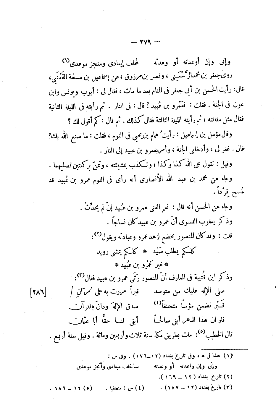 قلت، وقد كان المنصور يخضع لزهد عمرو وعبادته ويقول (2) : كلكم يطلب صيد * كلكم يمشى رويد * غير عمرو بن عبيد * وذكر ابن قتيبة في المعارف أن المنصور رثى عمرو بن عبيد فقال (3) : صلى الإله عليك من متوسد * قبرا مررت به على مران / قبر تضمن مؤمنا متحنفا (4) * صدق الإله ودان بالقرآن فلو أن هذا الدهر أبقى صالحا * أبقى لنا حقا أبا عثمان قال الخطيب (5) : مات بطريق مكة سنة ثلاث وأربعين ومائة.