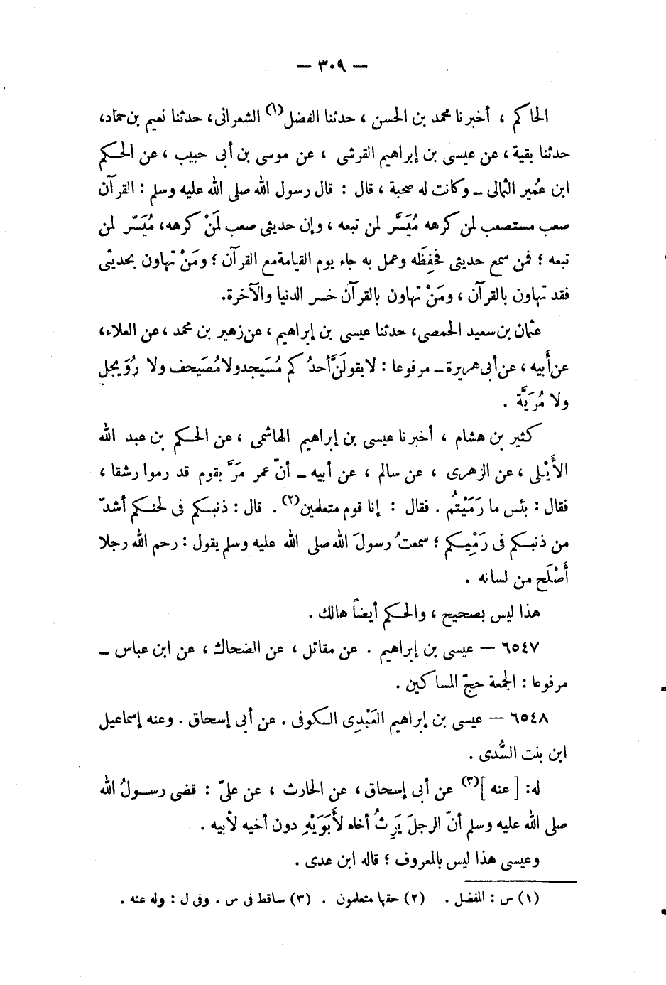 الحاكم، أخبرنا محمد بن الحسن، حدثنا الفضل (1) الشعرانى، حدثنا نعيم بن حماد، حدثنا بقية، عن عيسى بن إبراهيم القرشي، عن موسى بن أبي حبيب، عن الحكم ابن عمير الثمالى - وكانت له صحبة، قال: قال رسول الله صلى الله عليه وسلم: القرآن صعب مستصعب لمن كرهه ميسر لمن تبعه، وإن حديثى صعب لمن كرهه، ميسر لمن تبعه، فمن سمع حديثى فحفظه وعمل به جاء يوم القيامة مع القرآن، ومن تهاون بحديثي