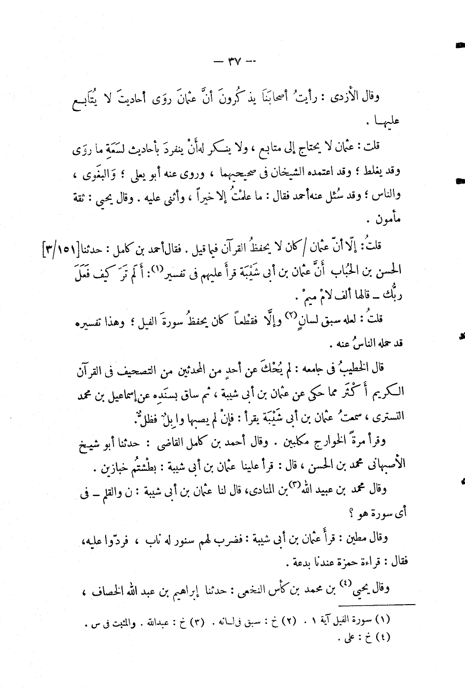 فقال أحمد بن كامل: حدثنا الحسن بن الحباب أن عثمان بن أبي شيبة قرأ عليهم في تفسير (1) : ألم تر كيف فعل ربك - قالها الف لام ميم.