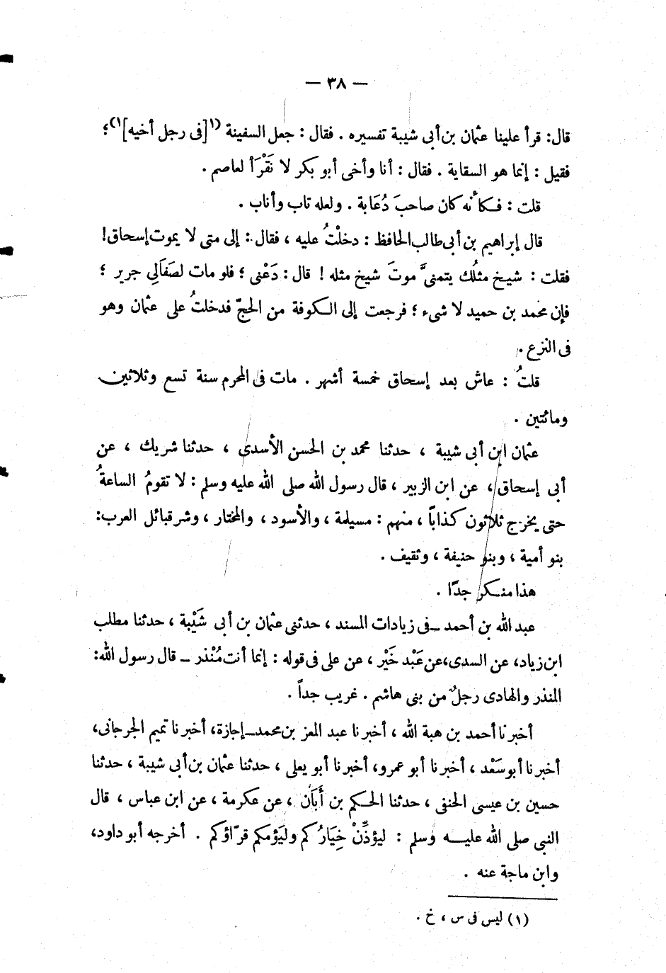 قال إبراهيم بن أبي طالب الحافظ: دخلت عليه، فقال: إلا متى لا يموت إسحاق! فقلت: شيخ مثلك يتمنى موت شيخ مثله! قال: دعني، فلو مات لصفالى جرير، فإن محمد بن حميد لا شئ، فرجعت إلى الكوفة من الحج فدخلت على عثمان وهو في النزع.