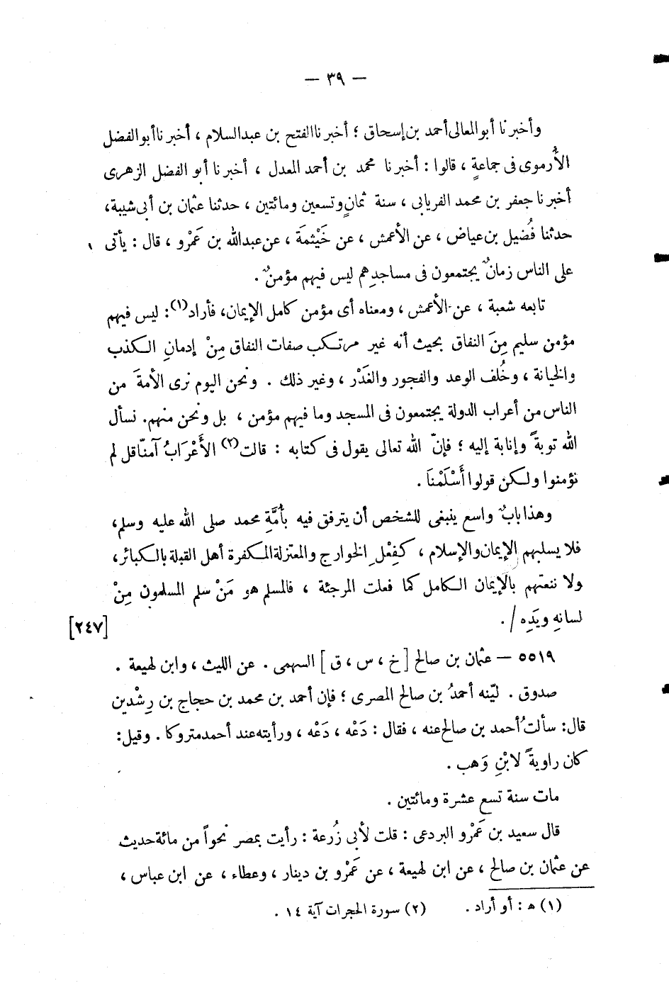 وأخبرنا أبو المعالى أحمد بن إسحاق، أخبرنا الفتح بن عبد السلام، أخبرنا أبو الفضل الارموى في جماعة، قالوا: أخبرنا محمد بن أحمد المعدل، أخبرنا أبو الفضل الزهري أخبرنا جعفر بن محمد الفريابي، سنة ثمان وتسعين ومائتين، حدثنا عثمان بن أبي شيبة، حدثنا فضيل بن عياض، عن الأعمش، عن خيثمة، عن عبد الله بن عمرو، قال: يأتي على الناس زمان يجتمعون في مساجدهم ليس فيهم مؤمن.