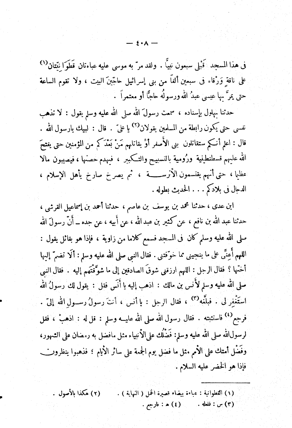 ولقد مر به موسى عليه عباءتان قطوانيتان (1) على ناقة ورقاء في سبعين ألفا من بنى إسرائيل حاجين البيت، ولا تقوم الساعة حتى يمر بها عيسى عبد الله ورسوله حاجا أو معتمرا.