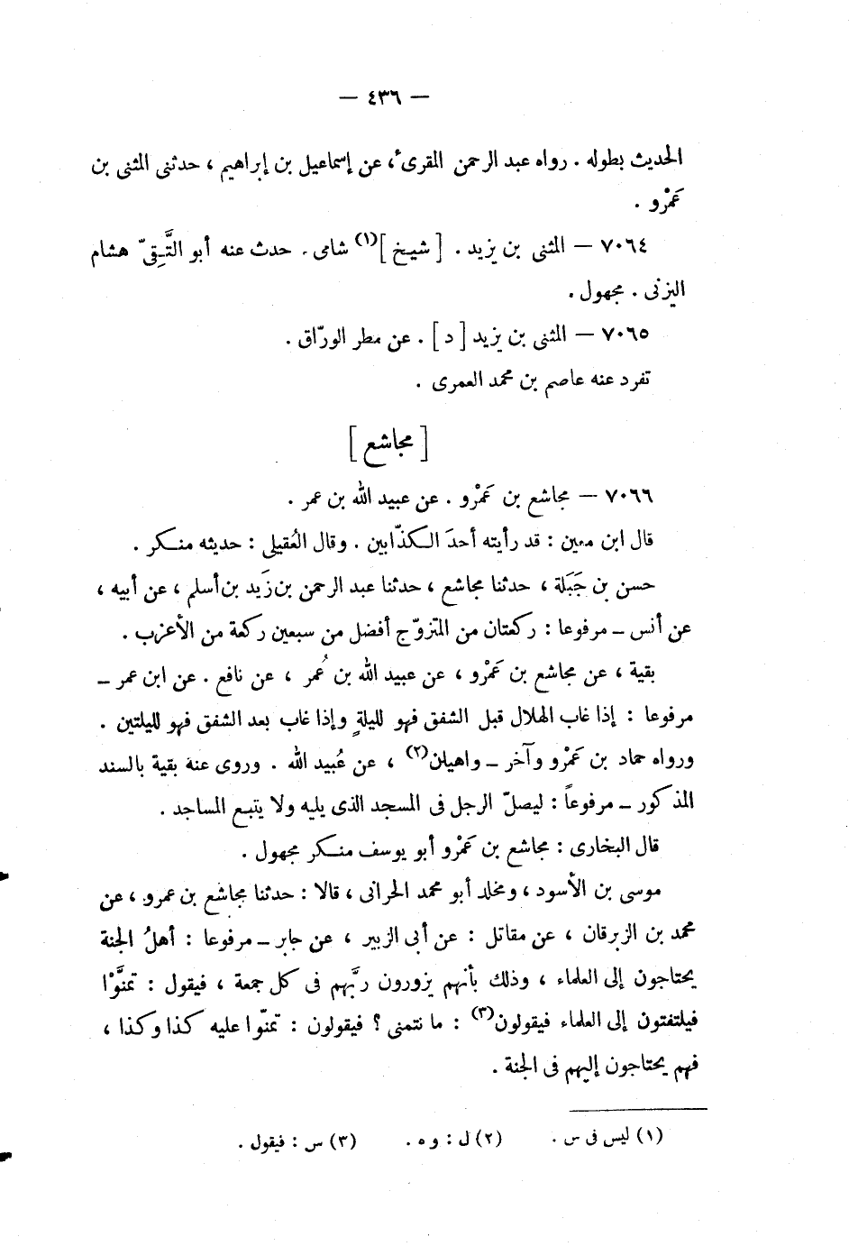موسى بن الأسود، ومخلد أبو محمد الحراني، قالا: حدثنا مجاشع بن عمرو، عن محمد بن الزبرقان، عن مقاتل: عن أبي الزبير، عن جابر - مرفوعاً: أهل الجنة يحتاجون إلى العلماء، وذلك بأنهم يزورون ربهم في كل جمعة، فيقول: تمنوا فيلتفتون إلى العلماء فيقولون (3) : ما نتمنى؟ فيقولون: تمنوا عليه كذا وكذا، فهم يحتاجون إليهم في الجنة.