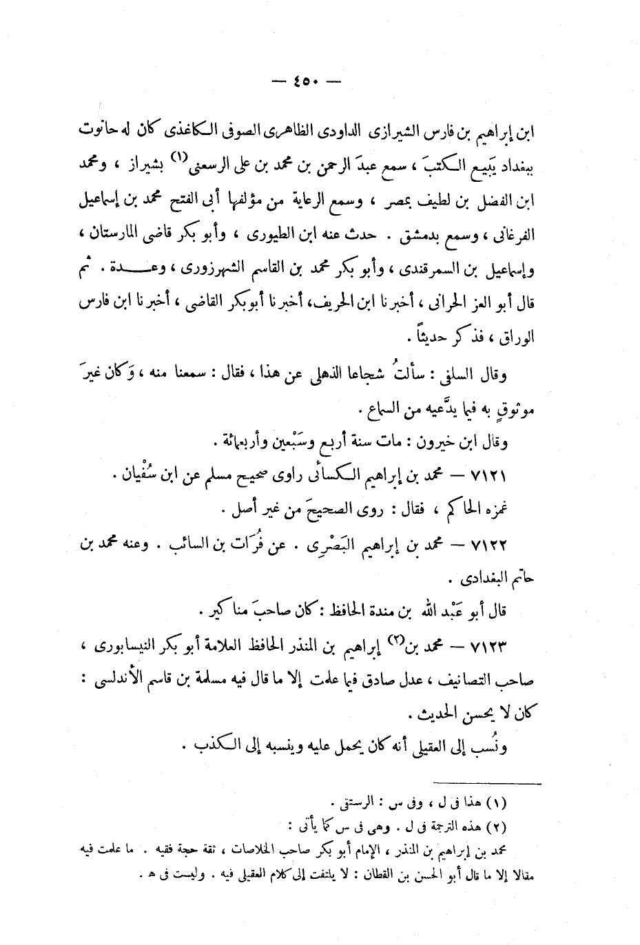 7123 - محمد بن (2) إبراهيم بن المنذر الحافظ العلامة أبو بكر النيسابوري، صاحب التصانيف، عدل صادق فيما علمت إلا ما قال فيه مسلمة بن قاسم الأندلسي: كان لا يحسن الحديث ونسب إلى العقيلي أنه كان يحمل عليه وينسبه إلى الكذب.