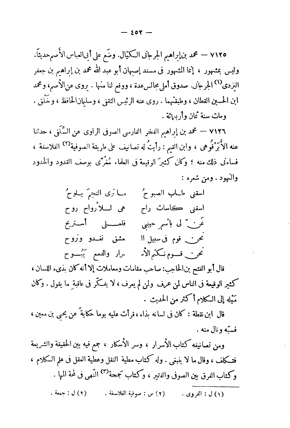 7126 - محمد بن إبراهيم الفخر الفارسى الصوفي الراوي عن السلفي، حدثنا عنه الابرقوهى، وابن القيم: رأيت له تصانيف على طريقة الصوفية (2) الفلاسفة، فساءنى ذلك منه، وكان كثير الوقيعة في العلماء مغرى بوصف القدود والخدود والنهود ومن شعره: اسقنى طاب الصبوح * ما ترى النجم يلوح اسقنى كاسات راح * هي للأرواح روح غن لي باسم حبيبي * فلعلي أستريح نحن قوم في سبيل العشق * نغدو ونروح نحن قوم نكتم الأسرار * والدمع يبوح قال أبو الفتح بن الحاجب: صاحب مقامات ومعاملات إلا أنه كان بذئ اللسان، كثير الوقيعة في الناس لمن عرف ولمن لم يعرف، لا يفكر في عاقبة ما يقول.