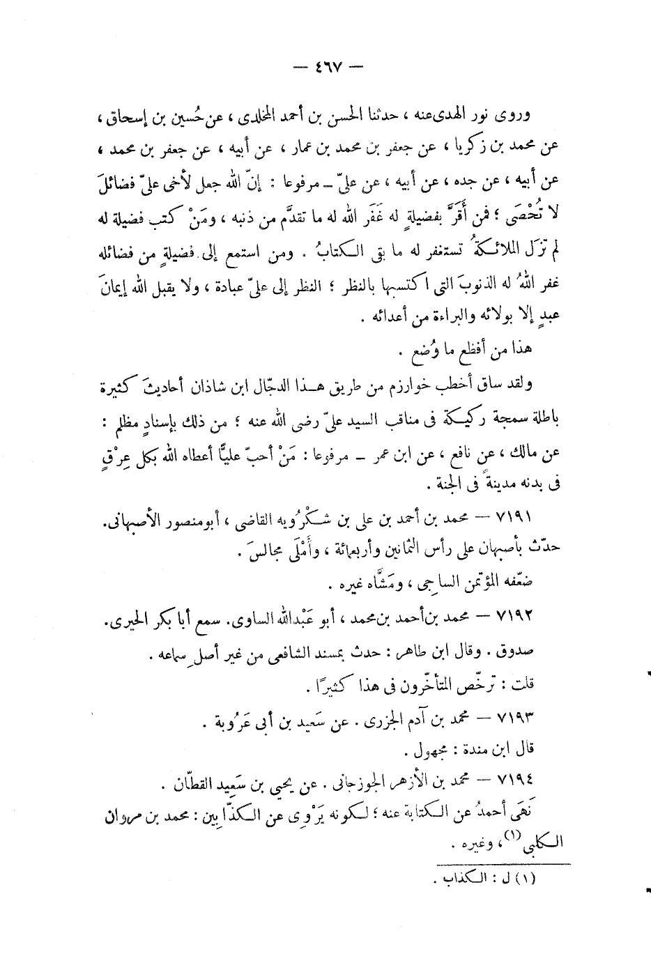 ولقد ساق أخطب خوارزم من طريق هذا الدجال ابن شاذان أحاديث كثيرة باطلة سمجة ركيكة في مناقب السيد علي رضي الله عنه، من ذلك بإسناد مظلم: عن مالك، عن نافع، عن ابن عمر - مرفوعاً: من أحب عليا أعطاه الله بكل عرق في بدنه مدينة في الجنة.