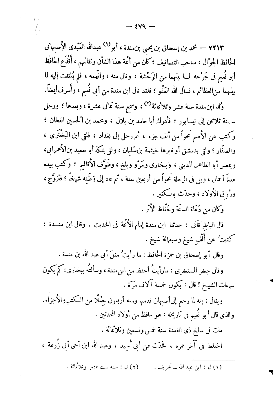 7213 - محمد بن إسحاق بن يحيى بن مندة، أبو (1) عبد الله العبدي الأصبهاني الحافظ الجوال، صاحب التصانيف، كان من أئمة هذا الشأن وثقاتهم، أقذع الحافظ أبو نعيم في جرحه لما بينهما من الوحشة، ونال منه، واتهمه، فلم يلتفت إليه لما بينهما من العظائم، نسأل الله العفو، فلقد نال ابن مندة من أبي نعيم، وأسرف أيضا.