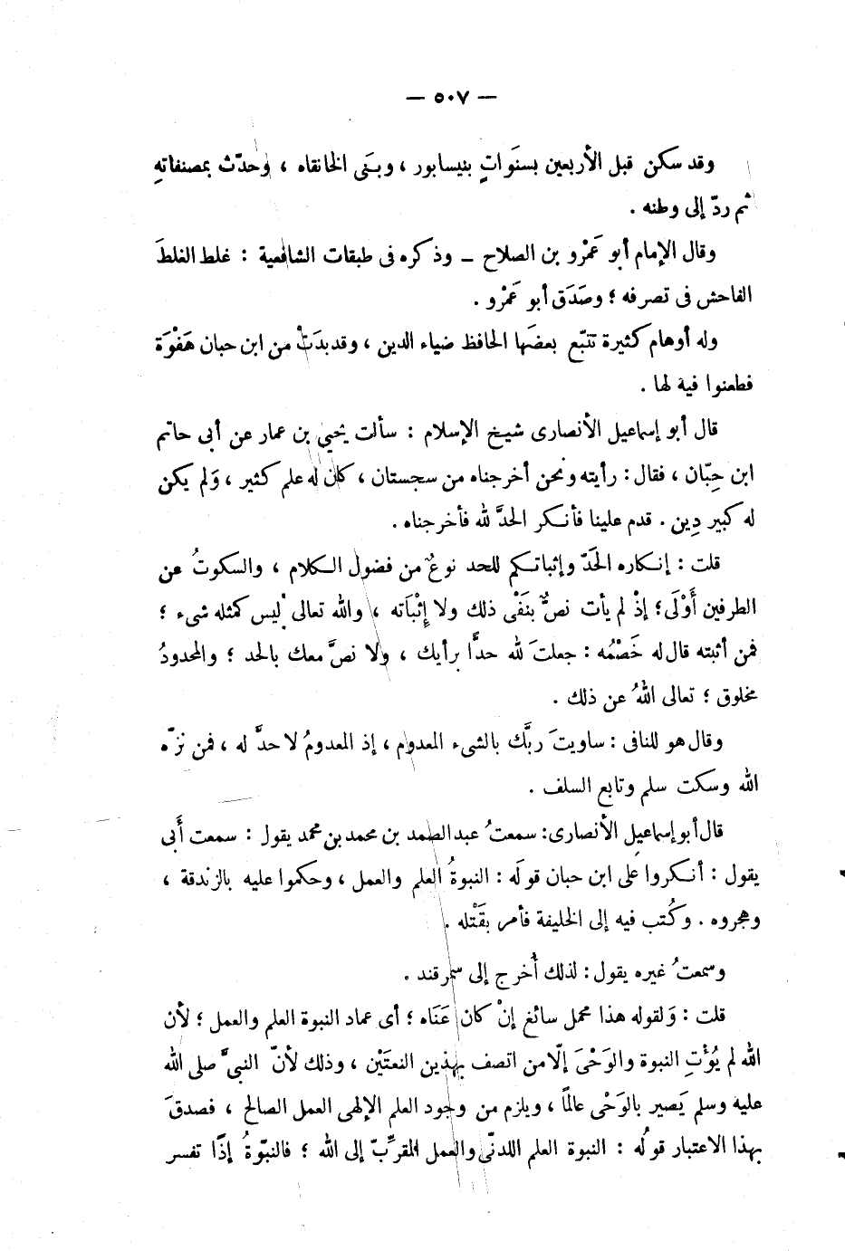 قال أبو إسماعيل الأنصاري: سمعت عبد الصمد بن محمد بن محمد يقول: سمعت أبي يقول: أنكروا على ابن حبان قوله: النبوة العلم والعمل، وحكموا عليه بالزندقة، وهجروه.