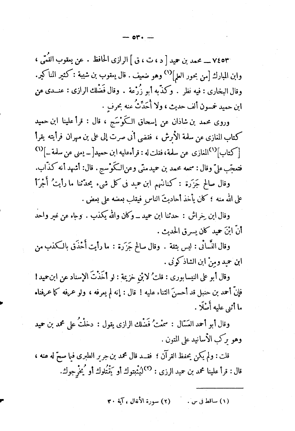 قلت: ولم يكن يحفظ القرآن، فقد قال محمد بن جرير الطبري فيما صح له عنه، قال: قرأ علينا محمد بن حميد الرزى: (2) ليثبتوك أو يقتلوك أو يخرجوك.