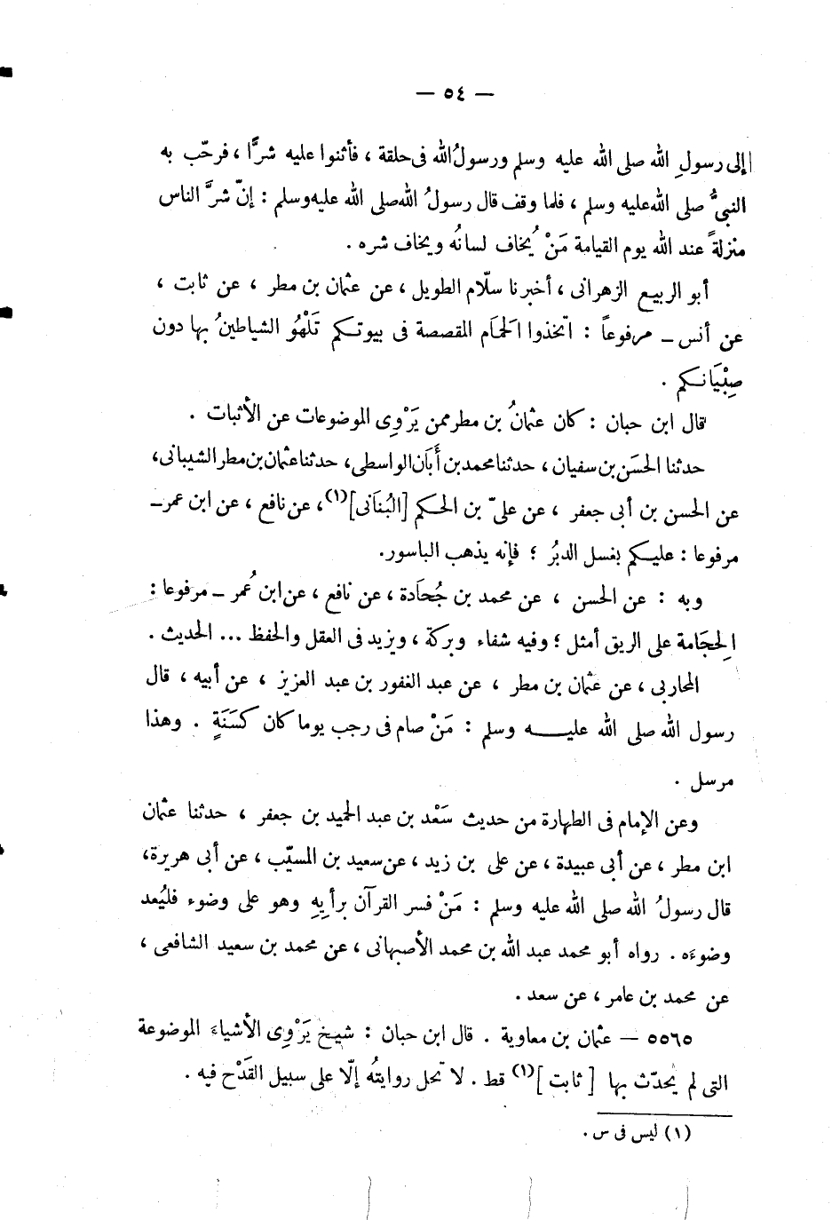 حدثنا الحسن بن سفيان، حدثنا محمد بن أبان الواسطي، حدثنا عثمان بن مطر الشيباني، عن الحسن بن أبي جعفر، عن علي بن الحكم [البناني] (1) ، عن نافع، عن ابن عمر -