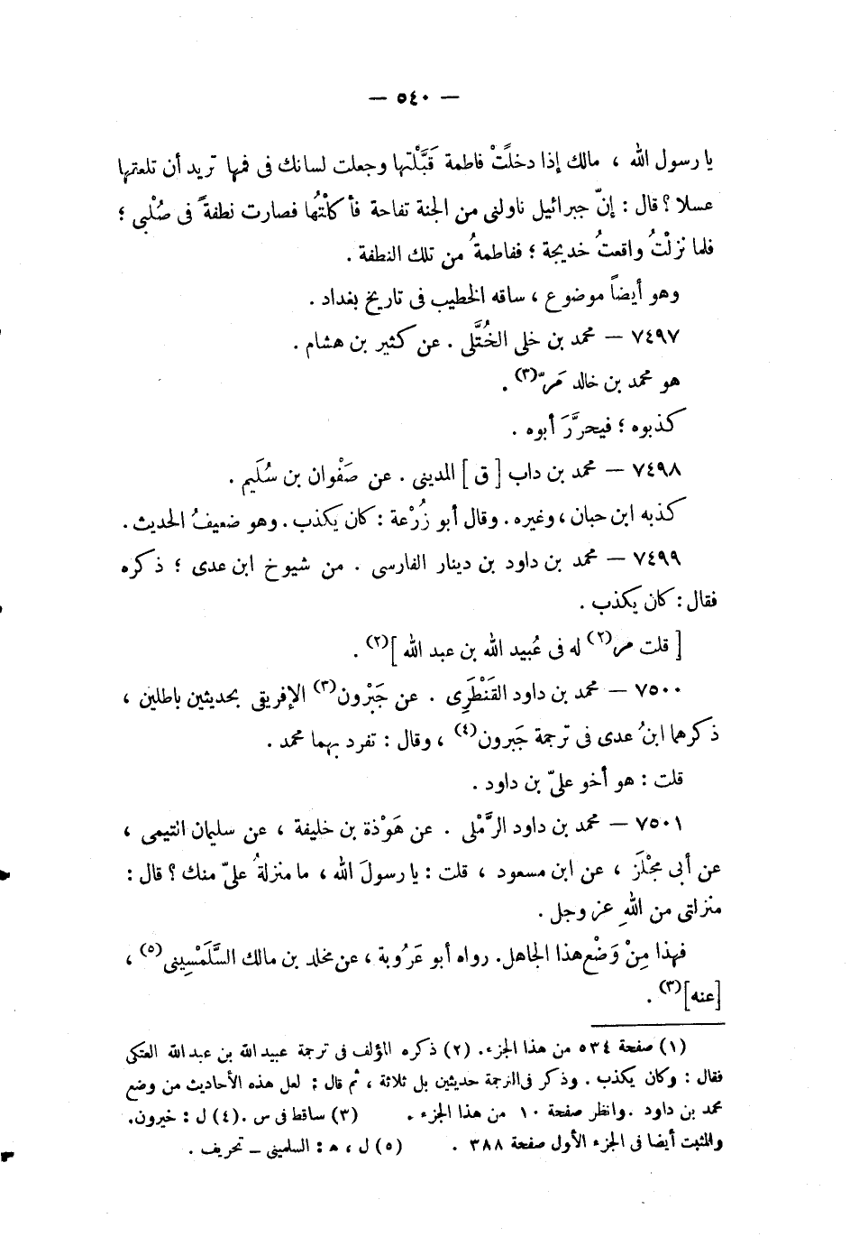 وذكر في الترجمة حديثين بل ثلاثة، ثم قال: لعل هذه الأحاديث من وضع محمد بن داود.