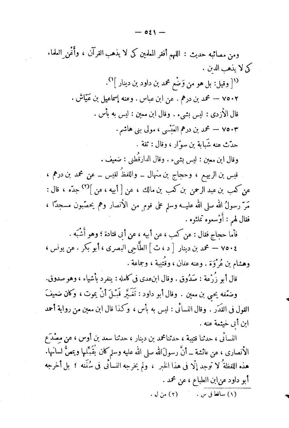 ومن مصائبه حديث: اللهم أفقر المعلمين كى لا يذهب القرآن، وأغن العلماء كى لا يذهب الدين.