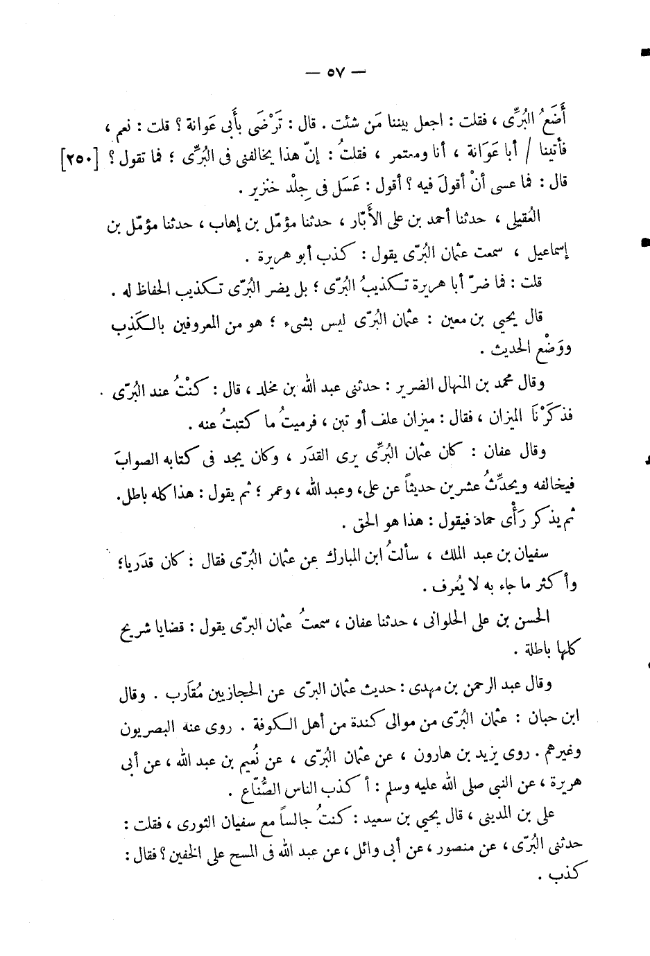 العقيلي، حدثنا أحمد بن علي الابار، حدثنا مؤمل بن إهاب، حدثنا مؤمل بن إسماعيل، سمعت عثمان البرى يقول: كذب أبو هريرة.