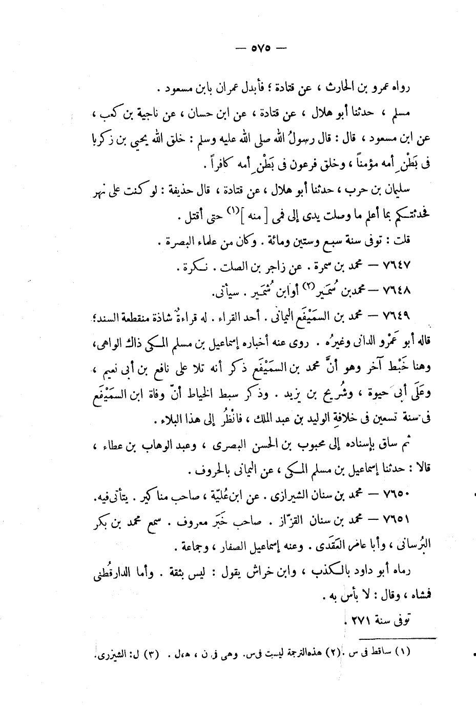 مسلم، حدثنا أبو هلال، عن قتادة، عن ابن حسان، عن ناجية بن كعب، عن ابن مسعود، قال: قال رسول الله صلى الله عليه وسلم: خلق الله يحيى بن زكريا في بطن أمه مؤمنا، وخلق فرعون في بطن أمه كافرا.
