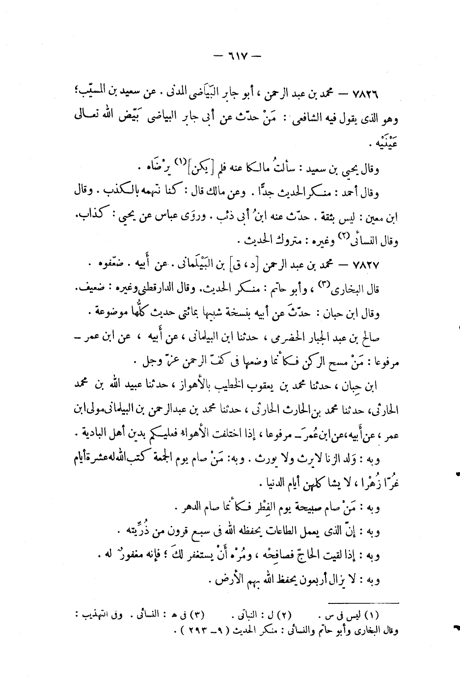 ابن حبان، حدثنا محمد بن يعقوب الخطيب بالأهواز، حدثنا عبيد الله بن محمد الحارثى، حدثنا محمد بن الحارث الحارثى، حدثنا محمد بن عبد الرحمن بن البيلمانى مولى ابن