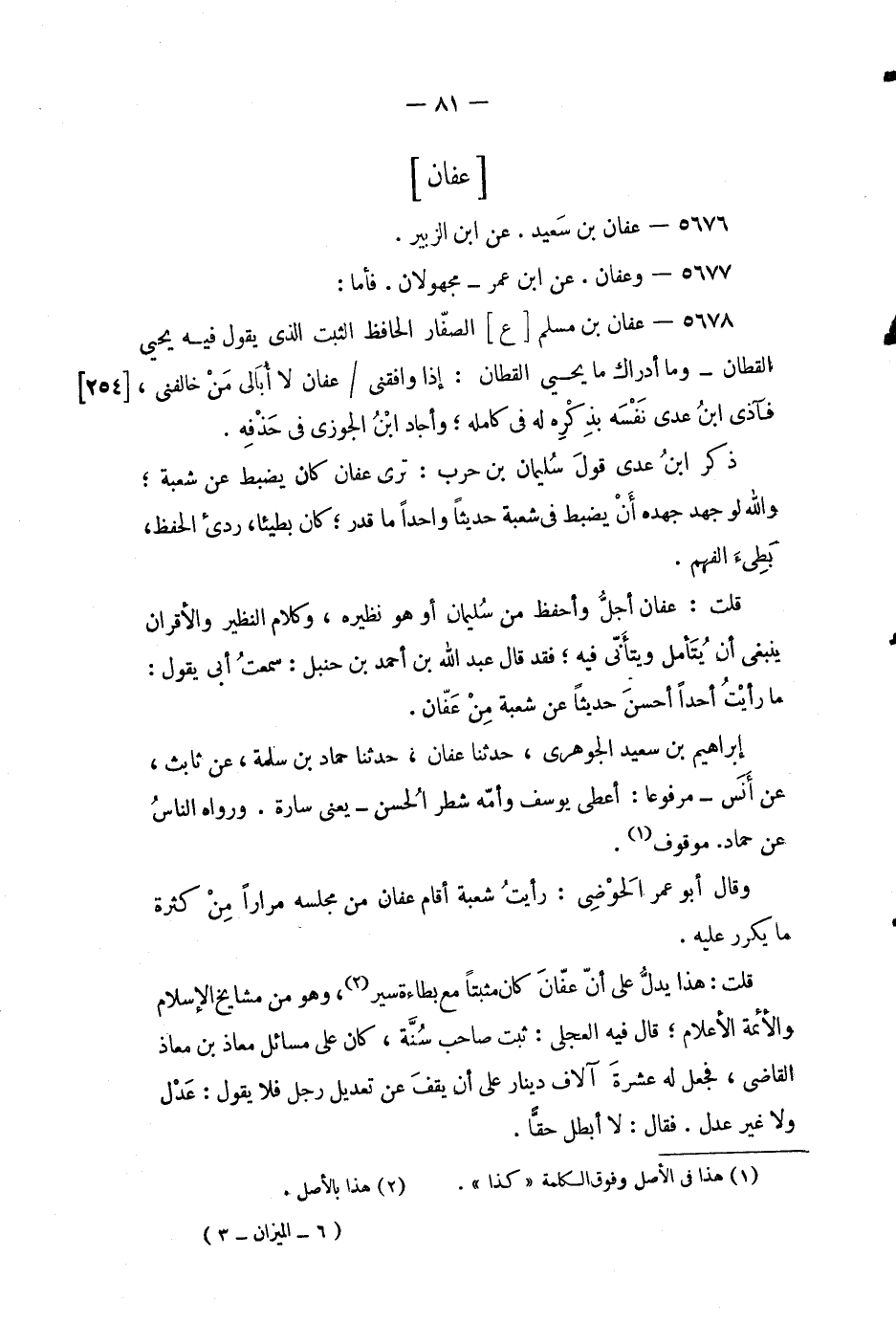 فأما: 5678 - عفان بن مسلم [ع] الصفار الحافظ الثبت الذي يقول فيه يحيى القطان - وما أدراك ما يحيى القطان: إذا وافقنى / عفان لا أبالى من خالفني، فآذى ابن عدي نفسه بذكره له في كامله، وأجاد ابن الجوزي في حذفه.