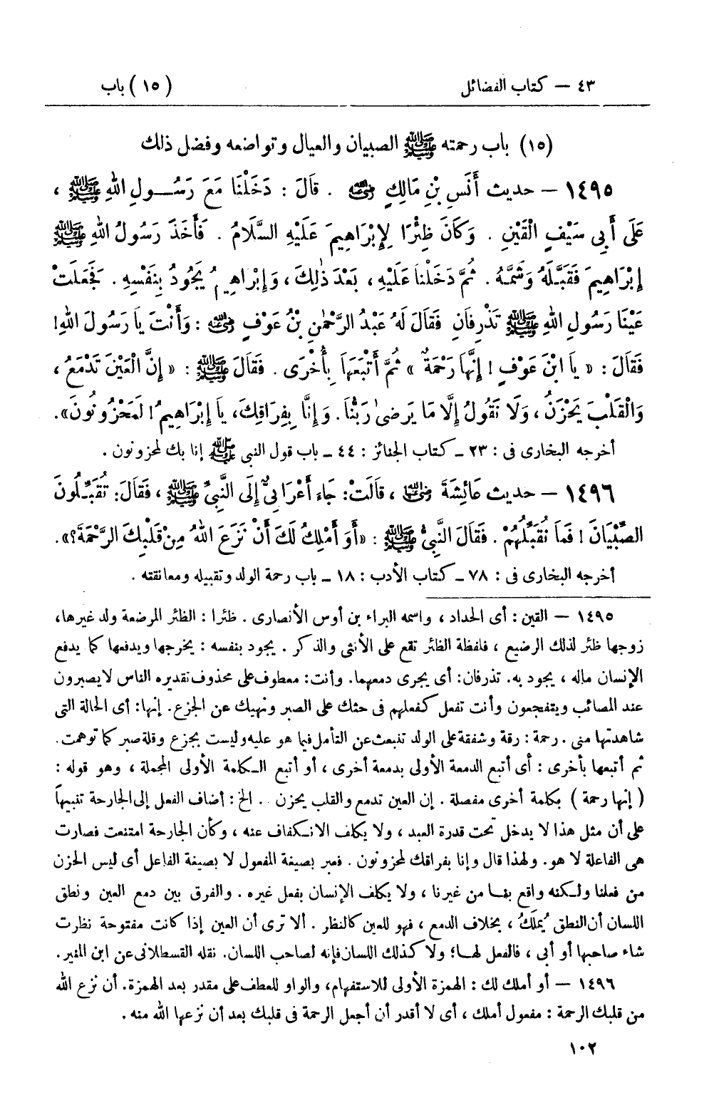 1495 - حديث أَنَسِ بْنِ مَالِكٍ رضي الله عنه قَالَ: دَخَلْنَا مَعَ رَسُولِ اللهِ صَلَّى اللَّهُ عَلَيْهِ وَسَلَّمَ، عَلَى أَبِي سَيْفٍ الْقَيْنِ وَكَانَ ظِئْرًا لإِبْرَاهِيمَ عَلَيْهِ السَّلاَمُ فَأَخَذَ رَسُولُ اللهِ صَلَّى اللَّهُ عَلَيْهِ وَسَلَّمَ إِبْرَاهِيمَ فَقَبَّلَهُ وَشَمَّهُ ثُمَّ دَخَلْنَا عَلَيْهِ، بَعْدَ ذلِكَ، وَإِبْرَاهِيمُ يَجُودُ بِنَفْسِهِ فَجَعَلَتْ عَيْنَا رَسُولِ اللهِ صَلَّى اللَّهُ عَلَيْهِ وَسَلَّمَ تَذْرِفَانِ فَقَالَ لَهُ عَبْدُ الرَّحْمنِ بْنُ عَوْفٍ رضي الله عنه: وَأَنْتَ يَا رَسُولَ اللهِ فَقَالَ: يَا ابْنَ عَوْفٍ إِنَّهَا رَحْمَةٌ ثُمَّ أَتْبَعَهَا بِأُخْرَى فَقَالَ صَلَّى اللَّهُ عَلَيْهِ وَسَلَّمَ: إِنَّ الْعَيْنَ تَدْمَعُ، وَالْقَلْبَ يَحْزَنُ، وَلاَ نَقُولُ إِلاَّ مَا يَرضى رَبُّنَا وَإِنَّا بِفِرَاقِكَ، يَا إِبْرَاهِيمُ لَمَحْزُونُونَ