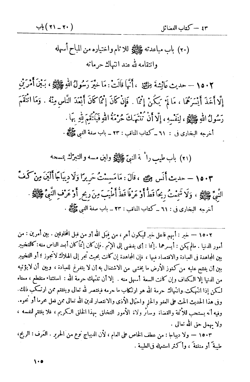 1502 - حديث عَائِشَة، أَنَّهَا قَالَتْ: مَا خُيِّرَ رَسُولُ اللهِ صَلَّى اللَّهُ عَلَيْهِ وَسَلَّمَ، بَيْنَ أَمْرَيْنِ إِلاَّ أَخَذَ أَيْسَرَهُمَا، مَا لَمْ يَكُنْ إِثْمًا فَإِنْ كَانَ إِثْمًا كَانَ أَبْعَدَ النَّاسِ مِنْهُ وَمَا انْتَقَمَ رَسُولُ اللهِ صَلَّى اللَّهُ عَلَيْهِ وَسَلَّمَ، لِنَفْسِهِ، إِلاَّ أَنْ تُنْتَهَكَ حُرْمَةُ اللهِ فَيَنْتَقِمَ للهِ بِهَا