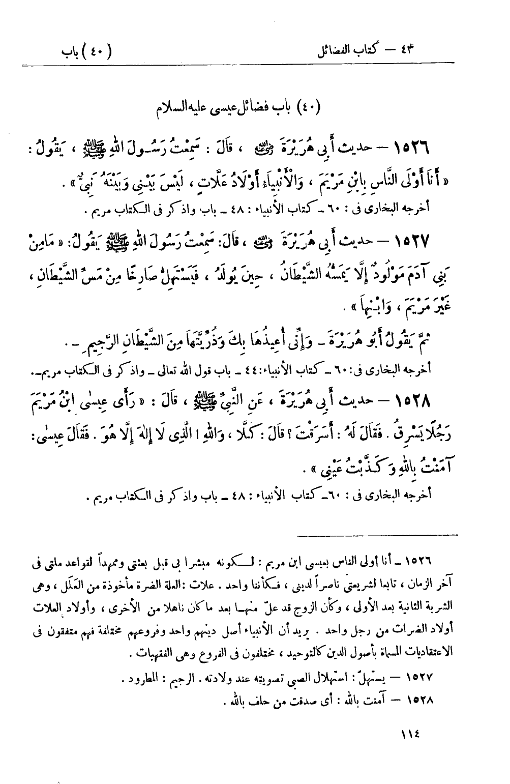 1526 - حديث أَبِي هُرَيْرَةَ رضي الله عنه، قَالَ: سَمِعْتُ رَسُولَ اللهِ صَلَّى اللَّهُ عَلَيْهِ وَسَلَّمَ يَقُولُ: مَا مِنْ بَنِي آدَمَ مَوْلُودٌ إِلاَّ يَمَسُّهُ الشَّيْطَانُ، حِينَ يُولَدُ، فَيَسْتَهِلُّ صَارِخًا مِنْ مَسِّ الشَّيْطَانِ، غَيْرَ مَرْيَمَ، وَابْنِهَا