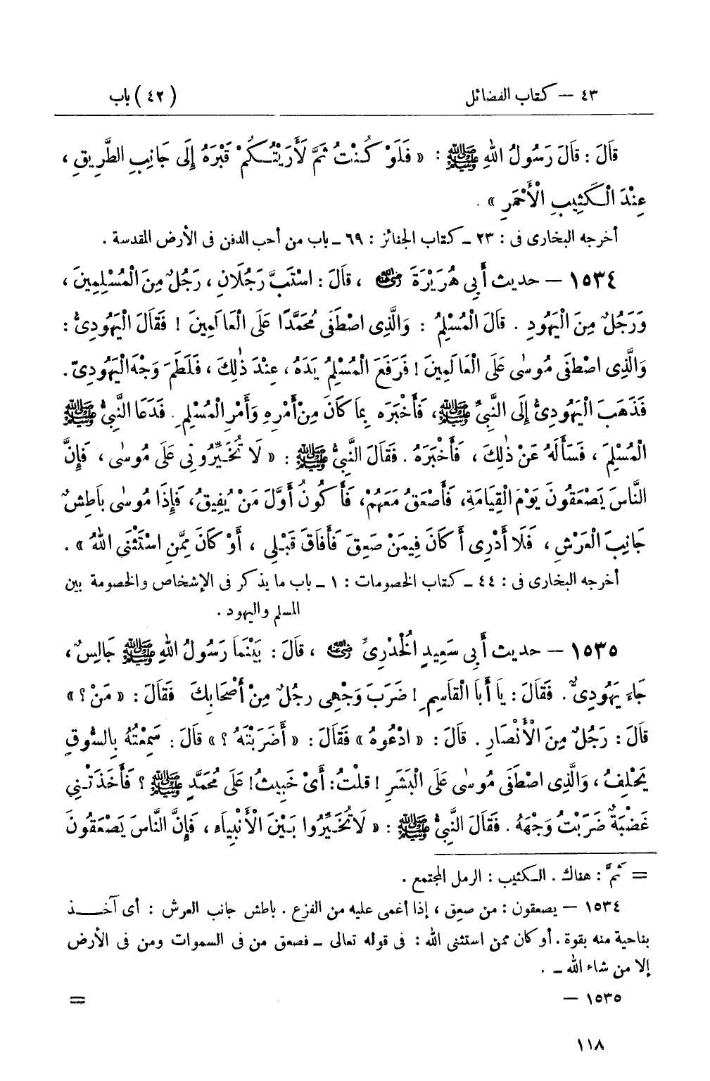 1534 - حديث أَبِي سَعِيدٍ الْخُدْرِيِّ رضي الله عنه، قَالَ: بَيْنَمَا رَسُولُ اللهِ صَلَّى اللَّهُ عَلَيْهِ وَسَلَّمَ جَالِسٌ، جَاءَ يَهُودِيٌّ فَقَالَ: يَا أَبَا الْقَاسِمِ ضَرَبَ وَجْهِي رَجُلٌ مِنْ أَصْحَابِكَ فَقَالَ: مَنْ قَالَ: رَجُلٌ مِنَ الأَنْصَارِ قَالَ: ادْعُوهُ فَقَالَ: أَضَرَبْتَهُ قَالَ: سَمِعْتُهُ بِالسُّوقِ يَحْلِفُ، وَالَّذِي اصْطَفَى مُوسى عَلَى الْبَشَرِ قلْتُ: أَيْ خَبِيثُ عَلَى مُحَمَّدٍ صَلَّى اللَّهُ عَلَيْهِ وَسَلَّمَ فَأَخَذَتْنِي غَضْبَةٌ ضَرَبْتُ وَجْهَهُ فَقَالَ النَّبِيُّ صَلَّى اللَّهُ عَلَيْهِ وَسَلَّمَ: لاَ تُخَيِّرُوا بَيْنَ الأَنْبِيَاءِ، فَإِنَّ النَّاسَ يَصْعَقُونَ -[119]- يَوْمَ الْقِيَامَةِ، فَأَكُون أَوَّلَ مَنْ تَنْشَقُّ عَنْهُ الأَرْضُ فَإِذَا أَنَا بِمُوسى آخِذٌ بِقَائِمَةٍ مِنْ قَوَائِمِ الْعَرْشِ، فَلاَ أَدْرِي أَكَانَ فِيمَنْ صَعِقَ أَمْ حُوسِبَ بِصَعْقَةِ الاولَى